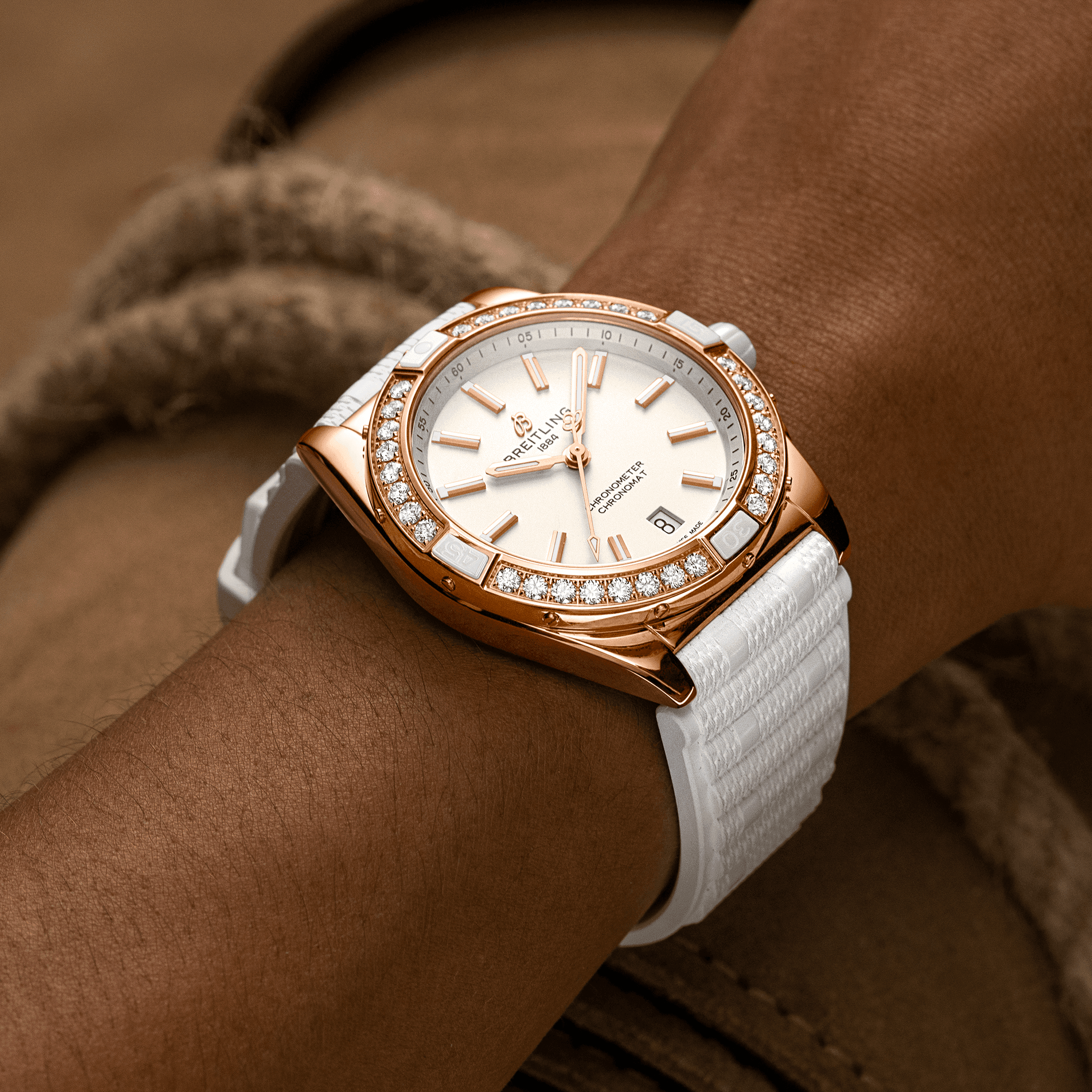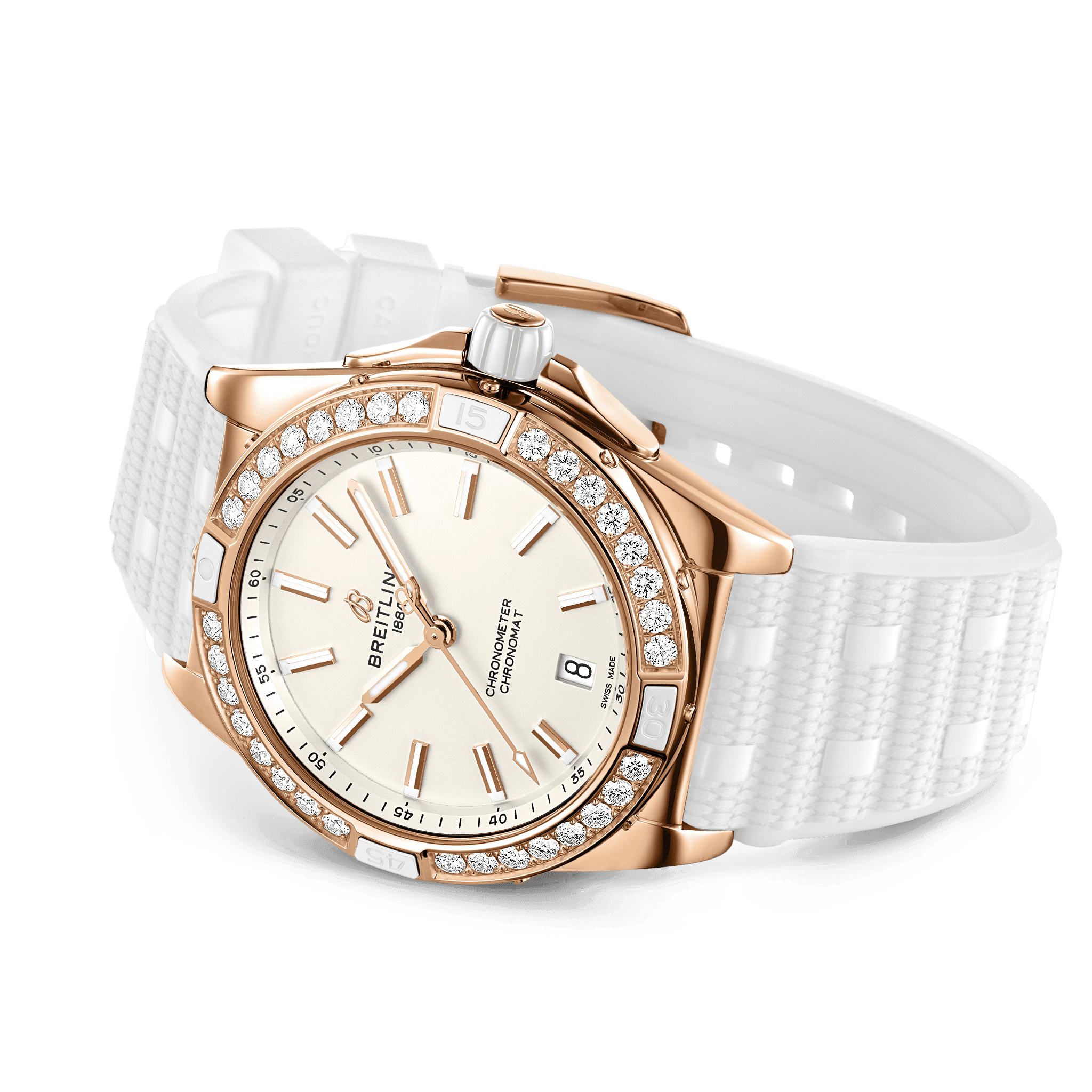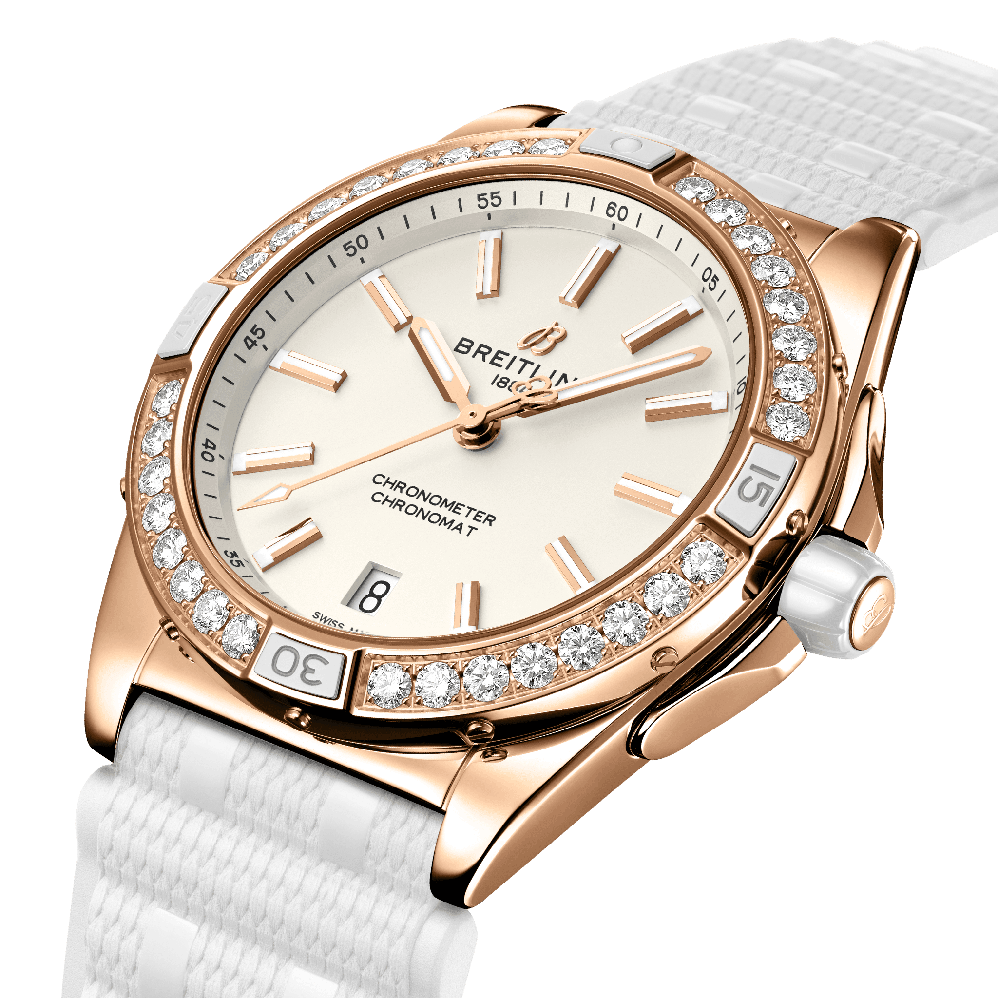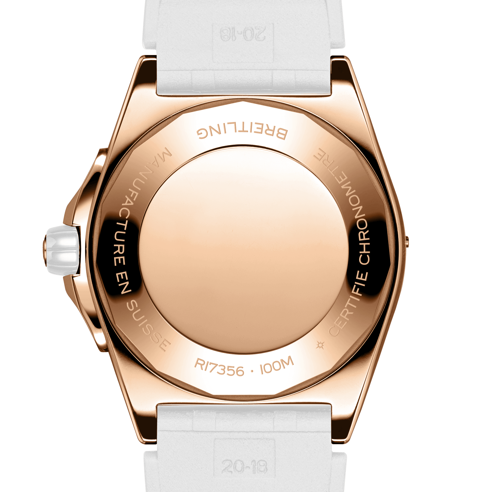 Unworn watch Breitling Super Chronomat Automatic 38 Origins, polished Small scale traceable 18k Red Gold case, reference R17356531G1S1, harmoniously combine precision engineering and timeless elegance. Crafted with meticulous attention to detail, they feature a sleek 38mm Small scale traceable 18k Red Gold case that combines stylish and durability. Cream dial with is decorated with a Small scale traceable 18k Red Gold «B» emblem below the 12 o’clock position and Small scale traceable 18k Red Gold polished hour markers and hands that glow in the dark thanks to luminescent filling. They are harmoniously complemented by a thin Small scale traceable 18k Red Gold second’s hand of a special design, which has a hand with luminescent filling and the manufacturer’s logo “B” on the other side. Date window located at the 6 o’clock position. The dial closed by a convex sapphire crystal, glareproofed both sides. A screw-on, durable Small scale traceable 18k Red Gold case back securely covers the watch mechanism. Small scale traceable 18k Red Gold crown with a white ceramic grip dome shape allows for easy adjustments. On end there is Breitling logo is applied. The watch features a polished Small scale traceable 18k Red Gold unidirectional rotating bezel with a ratcheting mechanism, a large luminous dot at the origin, and raised 15-minute tabs featuring white ceramic inserts and is factory set with 32 lab-grown diamonds. The Model comes with Breitling Caliber 17 contains 25 Jewels and has an approximate power reserve of 38 hours. The watch presented on the Featuring Breitling’s iconic and comfortable White Rubber strap, which fastens on Small scale traceable 18k Red Gold Tang- type. The water resistance is up to 100m/330ft.