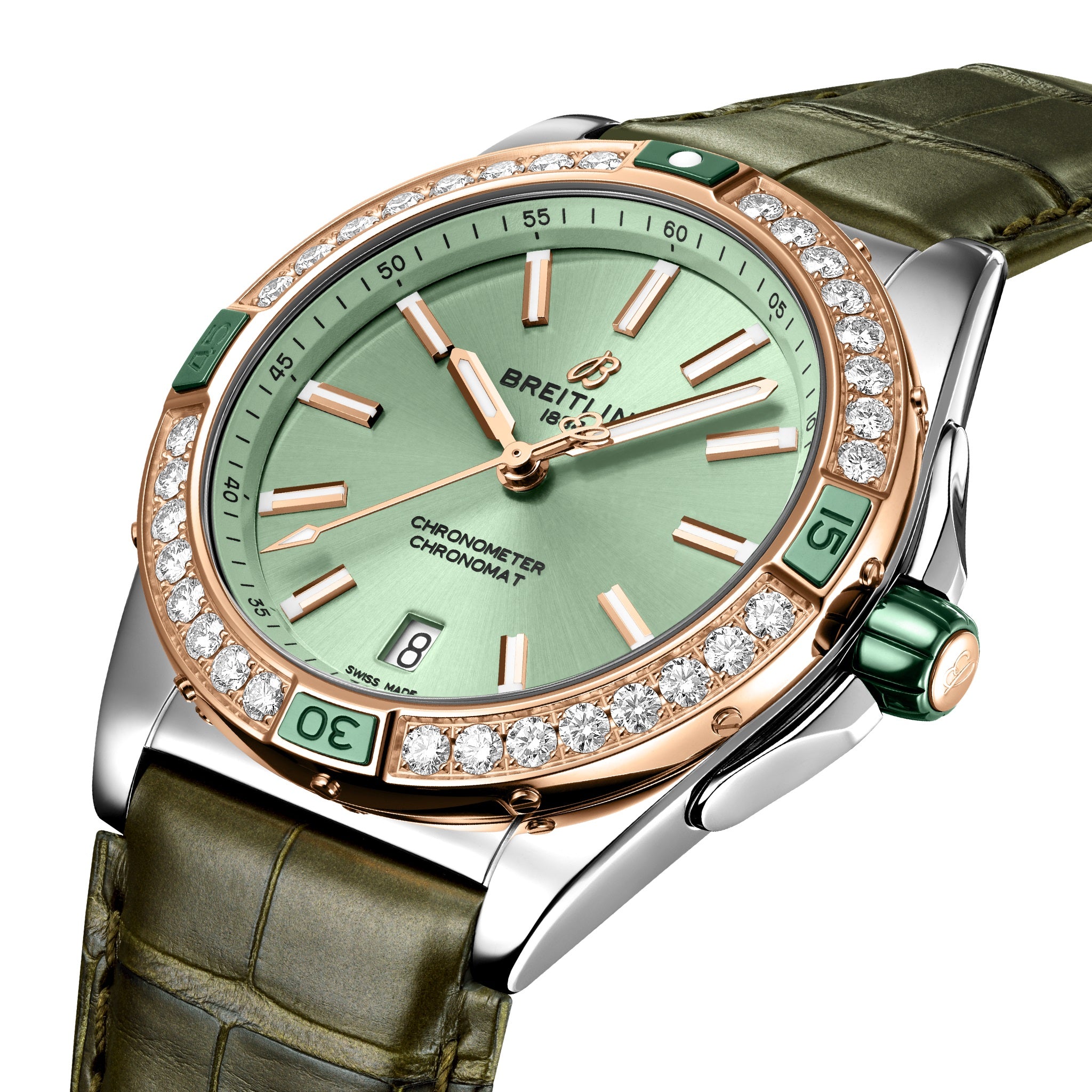 Unworn Breitling Super Chronomat AUTOMATIC Ref# U17356531L1P1, 38 mm, Green dial, Stainless steel & 18k red gold case. Bidirectional, slide rule bezel. Convex sapphire crystal, glareproofed both sides crystal. Breitling 17 calibre, Self-winding mechanical movement, 38 hours power reserve, 25 jewels. Alligator leather strap with Folding clasp. Water resistance 100 m.