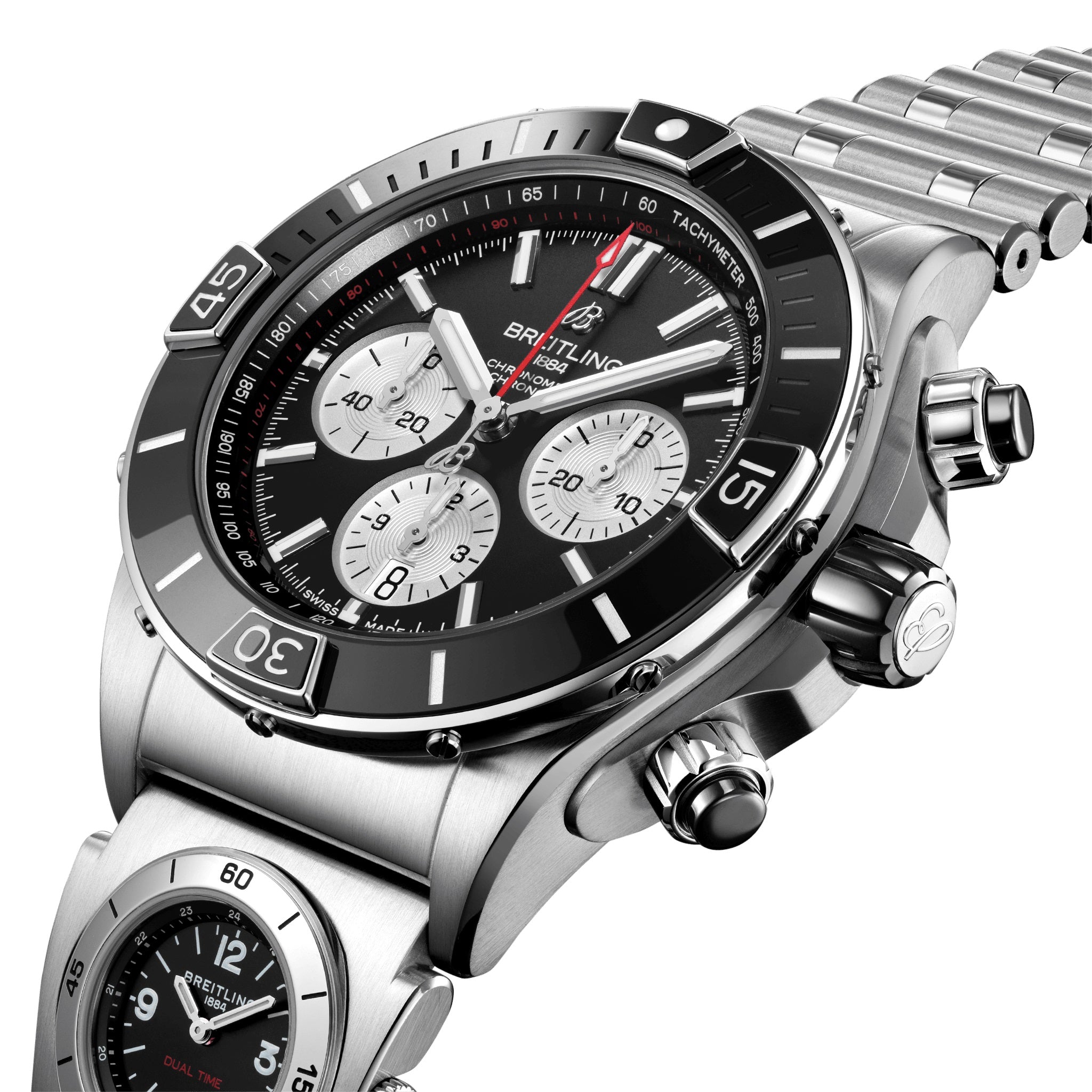 Unworn Breitling Super Chronomat B01 AB0136251B1A2, 44 mm, Black dial, Stainless steel case. Unidirectional ratcheted rotating bezel. Sapphire, glareproofed both sides crystal. Breitling 01 (Manufacture) calibre, Self-winding mechanical movement, 70 hrs power reserve, 47 jewels. Stainless steel bracelet. Water resistance 200 m.