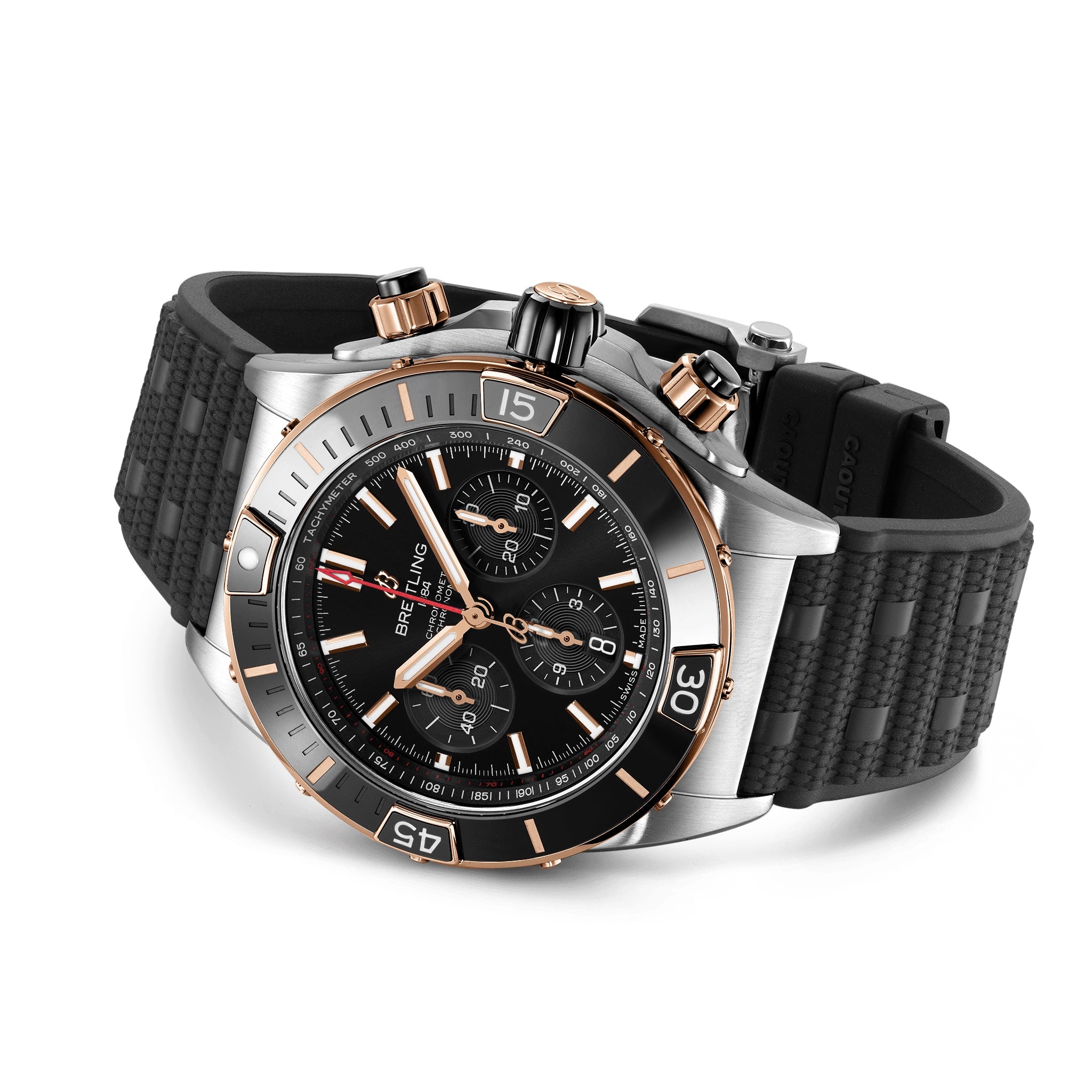 Unworn Breitling Super Chronomat B01 UB0136251B1S1, 44 mm, Black dial, Stainless steel & 18k red gold case. Unidirectional ratcheted rotating bezel. Sapphire, glareproofed both sides crystal. Breitling 01 (Manufacture) calibre, Self-winding mechanical movement, 70 hrs power reserve, 47 jewels. Rubber strap with Folding clasp. Water resistance 200 m.
