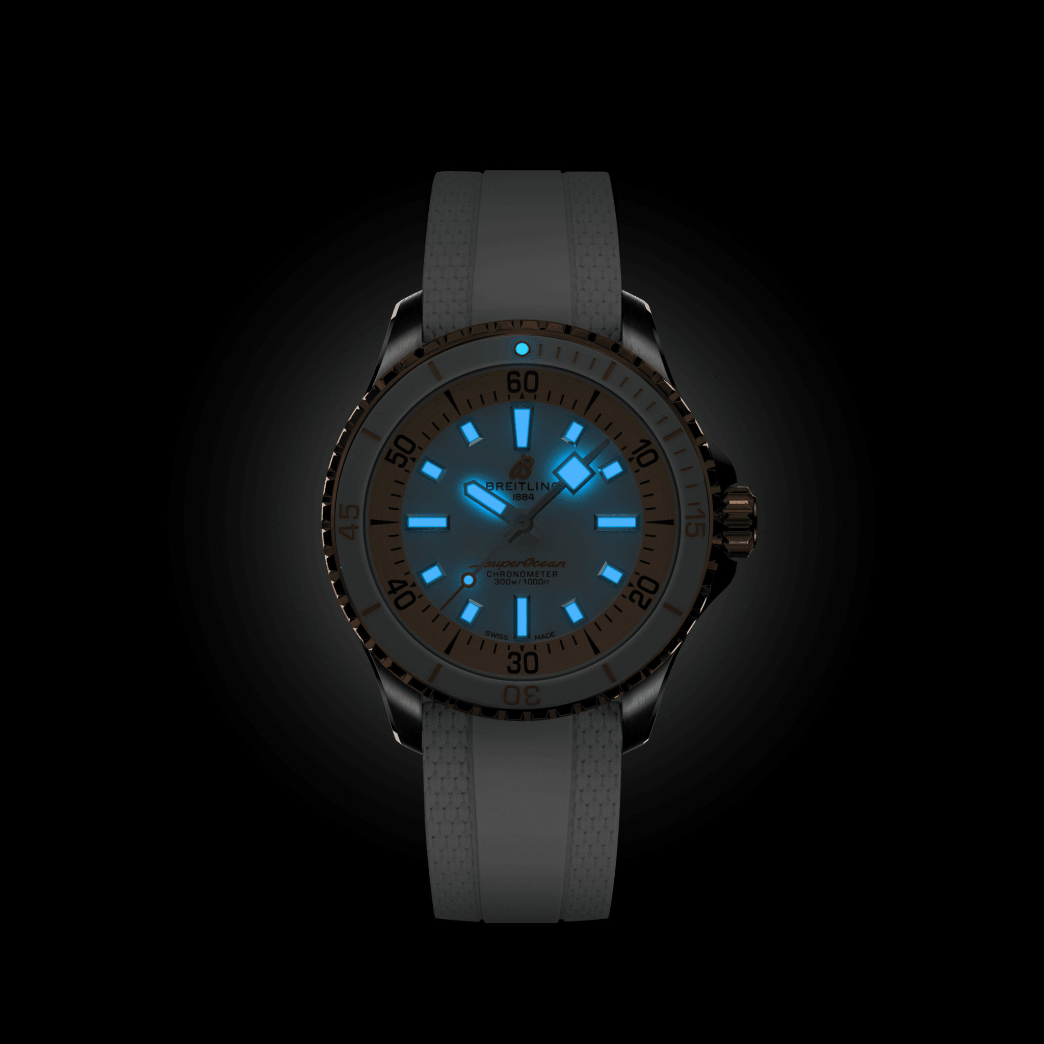 Unworn Breitling Watch Superocean Automatic 36 Stainless steel and 18k Red Gold case, Reference U173771A1A1S1: a fusion of style and functionality, designed to accompany you on every underwater adventure and beyond. Crafted with precision engineering and unmistakable Breitling flair, this timepiece is not just a watch—it’s a companion for the explorers of the deep and the adventurers of life. The 36mm case is made from durable stainless steel and provides the perfect balance of appearance and comfort on the wrist. Sporty, fresh and vibrant, this model features a matte white dial adorned with a red gold “B” logo at 12 o’clock and large applied luminous hour markers. It features an impressive flange made of 18k Red Gold with a clearly readable minute scale, on which every 10 minutes are marked with large black Arabic numerals. The dial is decorated with polished hour and minute hands with luminous fill. An elegant central seconds hand with a gold luminous circle and a gold tip harmoniously complements them. The watch has a screw-locked screwing down crown of polished 18k Red Gold with two spacers. Its ribbed edge provides a comfortable grip. The Breitling logo is applied to the end of the crown. The dial closed by a convex sapphire crystal, glare-proofed both sides and solid case back. Unidirectional 18K Red Gold ratcheting bezel with ribbed edge, adorned with a polished white ceramic ring with luminous starting point and dive scale displays precise dive times. Breitling Caliber 17 contains 26 Jewels and has an approximate power reserve of 38 hours. The model is presented on Breitling’s iconic and comfortable a White Rubber strap, which fastens on Stainless Steel Folding Clasp. The water resistance is up to 1000m (3300ft).