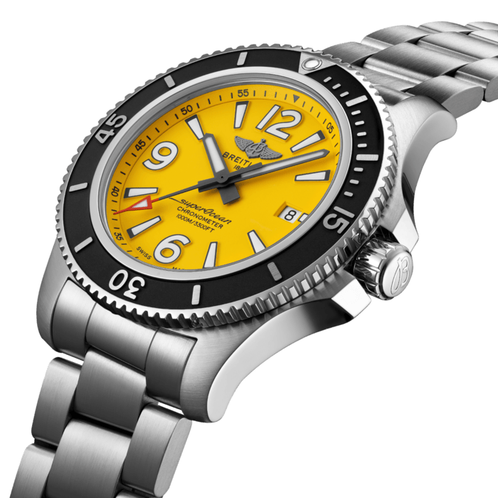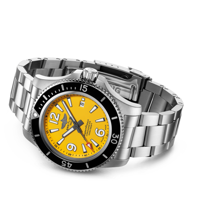 Unworn Breitling Men’s Superocean Automatic 44 Stainless Steel, 44mm watch, Reference A17367021I1A1. Yellow dial with luminous Arabic numerals 6, 9, 12, and large luminous index hour markers. Printed white minute track. Polished grey hour and minutes hands with luminous fill. The second’s hand features a red tip with luminescent fill. Steel screw-down crown with non-slip grip. Screw-locked, two gaskets. The dial closed by a convex sapphire crystal, glare-proofed both sides. Date window located at the 3 o’clock position. The unidirectional rotating silver-tone Stainless Steel fluted bezel with a black ring with engraved Arabic numerals 15, 30, 45, and indexes hour markers. Breitling COSC Certified caliber 17 contains 25 jewels and has an approximate power reserve of 38 hours. The watch presented on a Professional III Stainless Steel Bracelet with Folding Clasp with Safety Latch. The water resistance is up to 1000 meters/3300 feet.