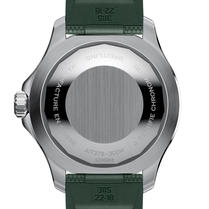 Introducing Unworn Breitling Watch Superocean Automatic 44, Stainless steel case, Reference A17376A31L1A1: a fusion of style and functionality, designed to accompany you on every underwater adventure and beyond. Crafted with precision engineering and unmistakable Breitling flair, this timepiece is not just a watch—it’s a companion for the explorers of the deep and the adventurers of life. The 44mm case is made from durable brushed and polished finished Stainless steel and provides the perfect balance of appearance and comfort on the wrist. Sporty, fresh and vibrant, this model features a matte Green dial adorned with a Gold-tone “B” logo at 12 o’clock and large Eilver-tone luminous hour markers. It features an impressive Silver flange with a clearly readable minute scale, on which every 10 minutes are marked with large black Arabic numerals. The dial is decorated with polished Silver-tone hour and minute hands with luminous fill. An elegant Silver-tone central seconds hand with a luminous circle and a tip harmoniously complements them. The watch has a screw-locked screwing down crown of polished Stainless steel with two spacers. Its ribbed edge provides a comfortable grip. The Breitling logo is applied to the end of the crown. The dial closed by a convex sapphire crystal, glare-proofed both sides and solid Stainless steel case back. Unidirectional Stainless steel ratcheting bezel with ribbed edge, adorned with a polished Green ceramic ring with luminous starting point and dive scale displays precise dive times. Breitling Caliber 17 contains 26 Jewels and has an approximate power reserve of 38 hours. The model is presented on Breitling’s iconic and comfortable a Green Straight strap of Rubber, which fastens on Stainless Steel Push Button Folding Clasp. The water resistance is up to 300m (1000ft).