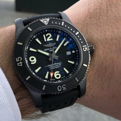 Breitling Superocean Automatic watch, 46mm, Black DLC stainless steel case. Black dial with applied large luminous index hour markers and applied polished Large Arabic numerals mark the 6, 9, and 12 o’clock positions. Luminescent hour and minute hands. Minute markers around the outer rim. The date displayed at the 3 o’clock position. Screw-locked crown with two gaskets. The dial closed by a convex sapphire crystal, glare-proofed both sides. The Unidirectional DLC-Coated Stainless Steel bezel with a black ceramic bezel insert. Breitling Caliber 17 contains 25 Jewels and has an approximate power reserve of 38 hours. The watch presented on a Diver Pro III Black Rubber Strap with Tang Buckle Clasp. The water resistance is up to 2000m/6600ft.
