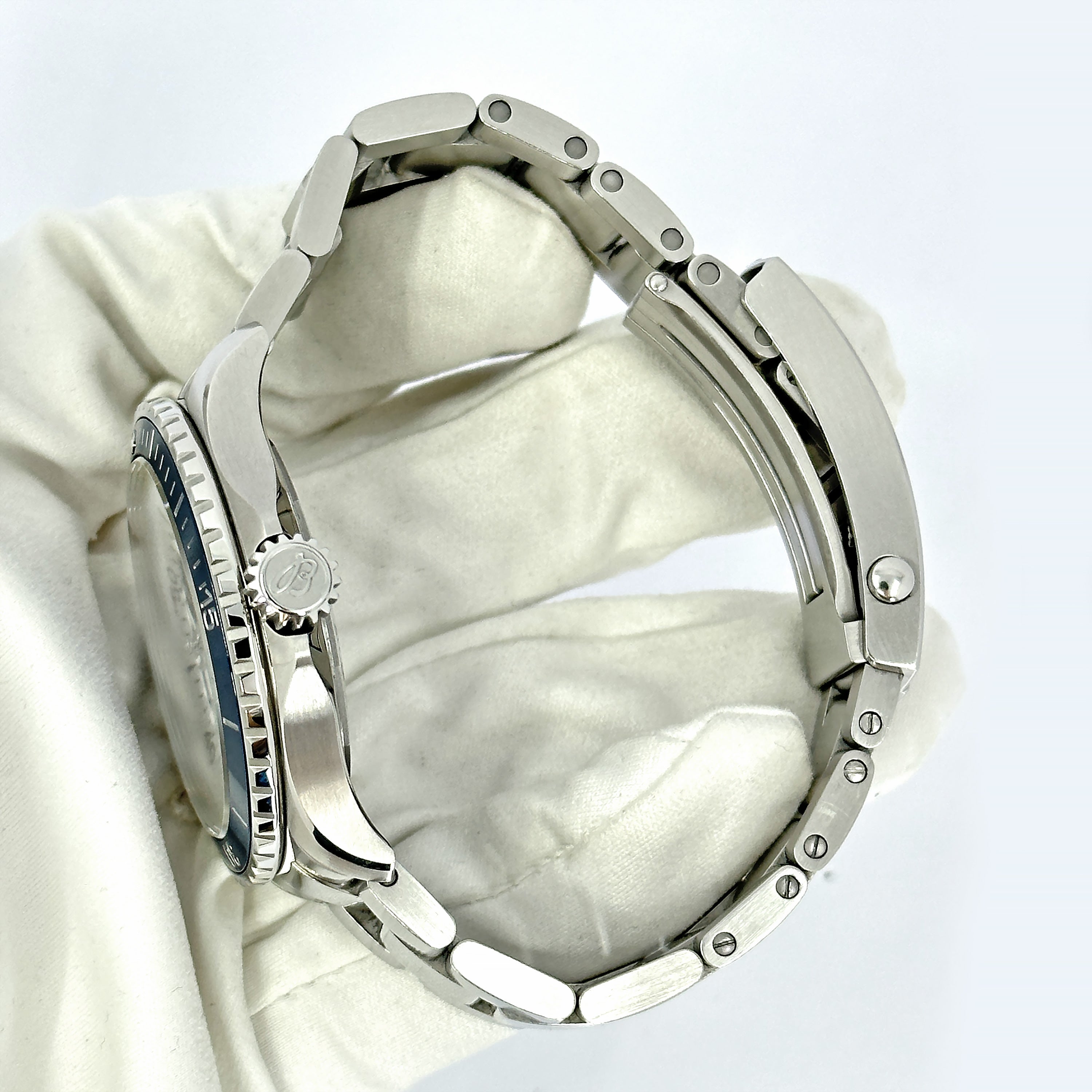 This Breitling Superocean Automatic Ref# A17375E71C1A1 comes ready to wear, featuring a brushed and polished stainless steel case with a water resistance of up to 300m (1,000 ft). It has a reliable Breitling 17 self-winding mechanical movement with 26 jewel and 38 hours of power reserve. The watch case has a diameter of 42mm and thickness of 12.5mm. It comes equipped with a 22/18mm stainless steel metal bracelet. This unidirectional ratcheted Polished blue ceramic bezel with diving scale and luminous starting dot and cambered sapphire crystal with glareproof coating provides a perfect view. Watch is in used, mint condition.