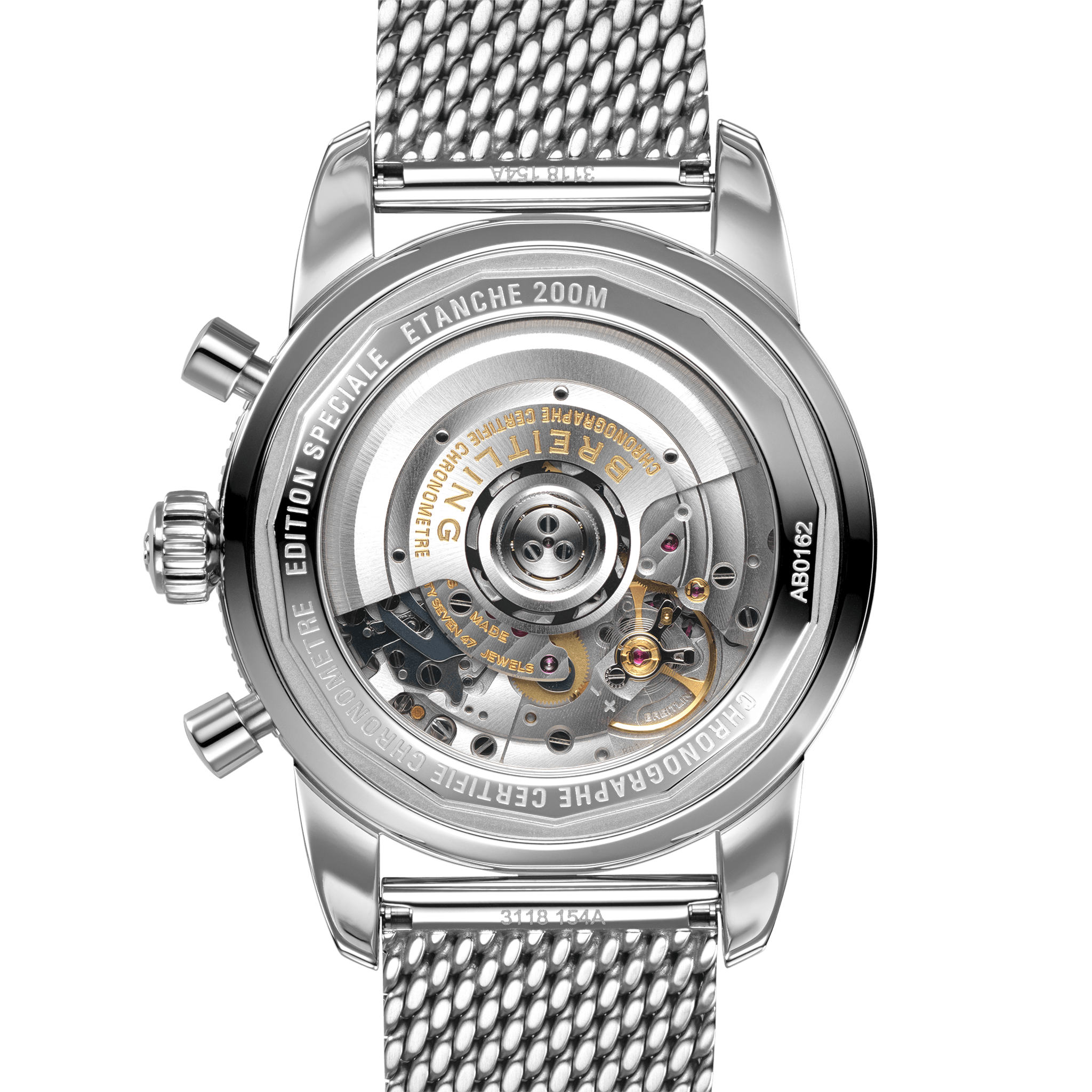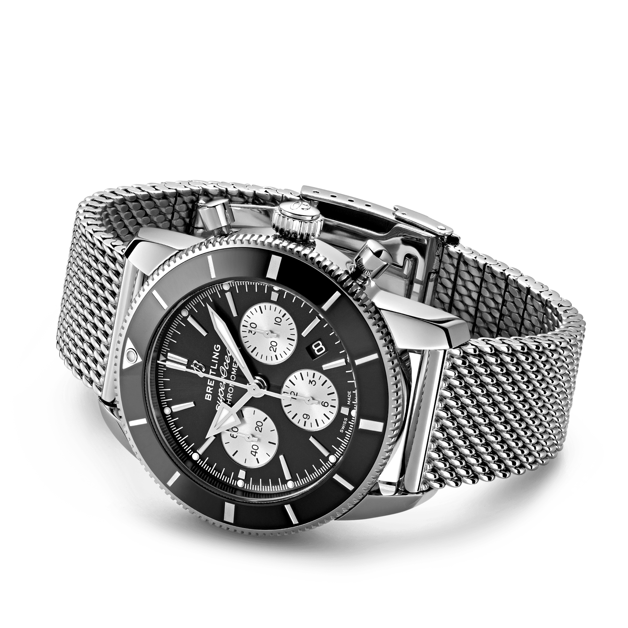 Breitling Superocean Heritage B01 Chronograph 44 watch, polished stainless steel case 44mm, Reference AB0162121B1A1. The model has Black dial with silver sub-dials and a “B” emblem below the 12 o’clock position. This watch is bold the iconic triangular-shaped large silver-tone different hands of polished steel with bold luminescent fill and applied polished stainless steel index hour markers with painted luminescent dot hour markers. Fine printed minute/seconds track on the outer perimeter. Date window located between the 4 and 5 o’clock position. The dial closed by a Cambered Scratch-resistant Sapphire Crystal with glare-proofed both sides. The watch has polished Stainless steel screw-locked crown with two gaskets. The crown has a ribbed edge for a comfortable grip. On end there is Breitling logo is applied. They have transparent case back of Sapphire Crystal made. The watch is equipped Stainless Steel unidirectional-ratcheted rotating fluted bezel with a black ceramic top ring with silver in the form of index markers and a triangle at the origin. The Model comes with Breitling Caliber B01 contains 47 Jewels and has an approximate power reserve of 70 hours. The watch presented on the polished Aero Classic bracelet with Folding Clasp with Safety Latch. The water resistance is up to 200m/660ft.