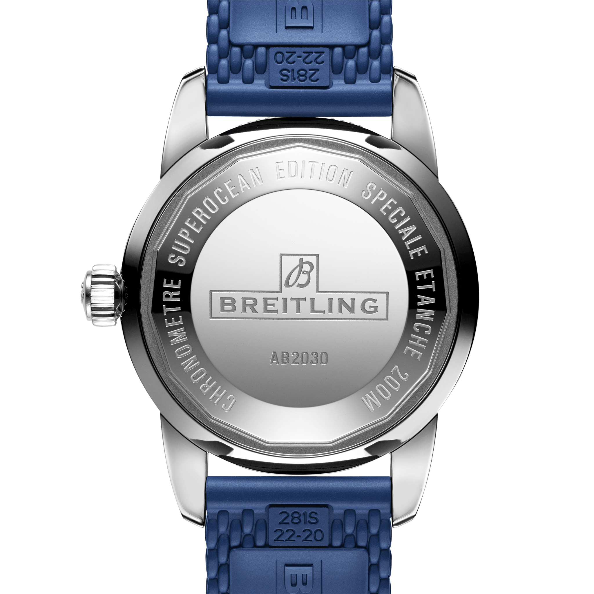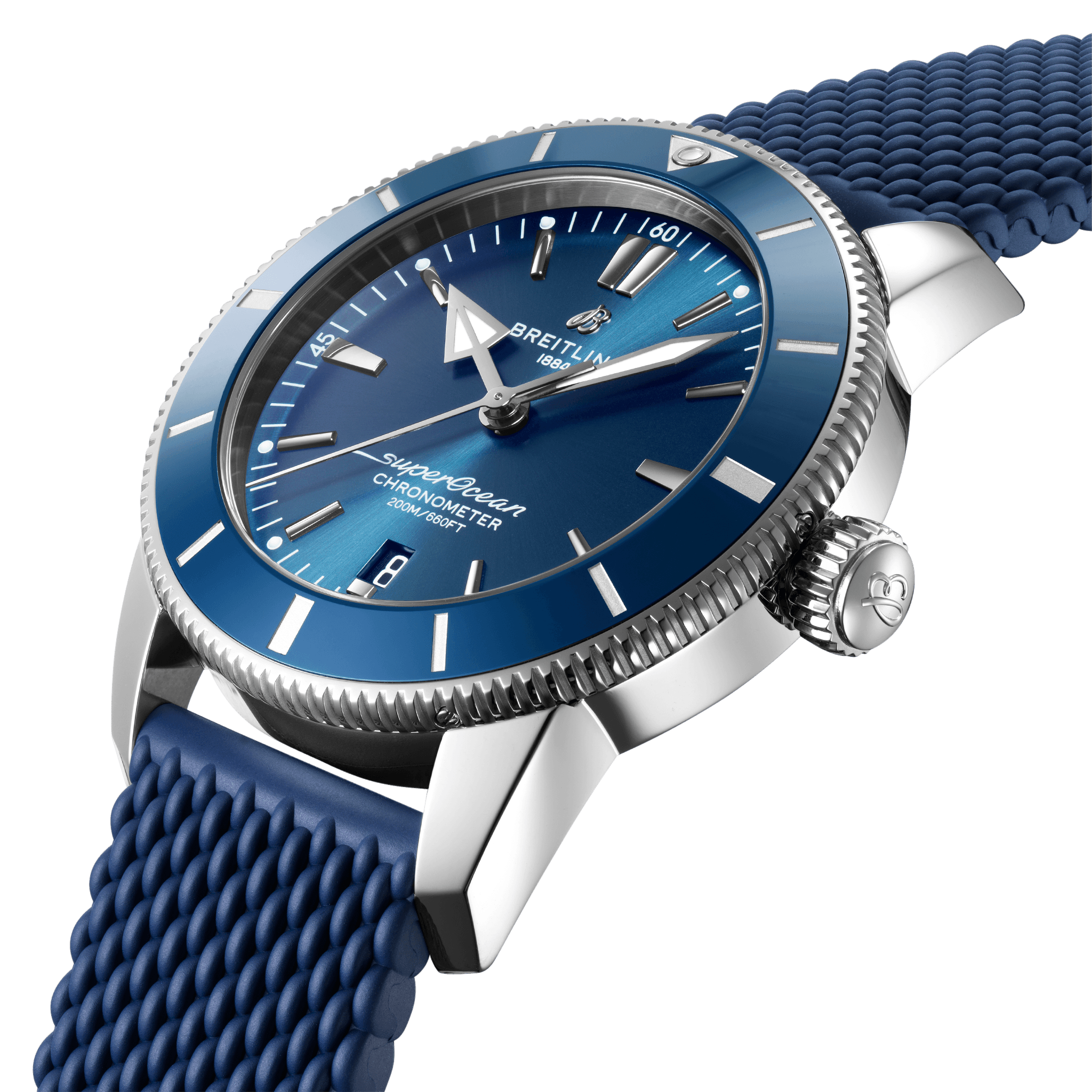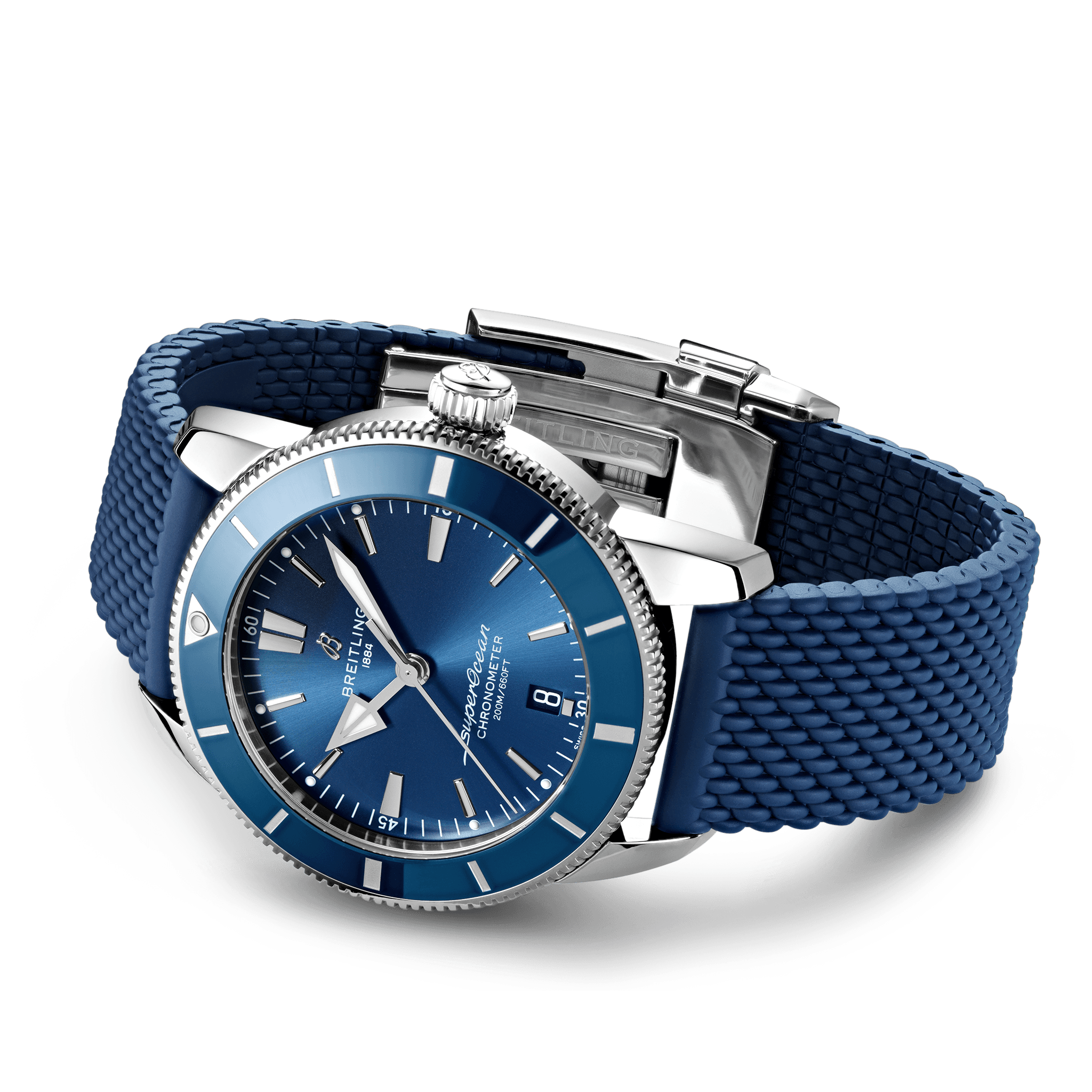 Breitling Superocean Heritage B20 Automatic 44 watch, polished stainless steel case 44mm, Reference AB2030161C1S1. The model has Bue dial with a “B” emblem below the 12 o’clock position. This watch is bold the iconic triangular-shaped large silver-tone different hands of polished steel with bold luminescent fill and applied polished stainless steel index hour markers with painted luminescent dot hour markers. Fine printed minute/seconds track with 15-minute Arabic numerals intervals on the outer perimeter. Date window located at the 6 o’clock position. The dial closed by a Cambered Scratch-resistant Sapphire Crystal with glare-proofed both sides. The watch has polished Stainless steel screw-locked crown with two gaskets. The crown has a ribbed edge for a comfortable grip and Breitling logo. They have solid screwed case back of Stainless steel. The watch is equipped Stainless Steel unidirectional-ratcheted rotating fluted bezel with a blue ceramic top ring with silver in the form of index markers and a triangle at the origin. The Model comes with Breitling Caliber B20, beats at 28’800 vph, contains 26 Jewels and has an approximate power reserve of 70 hours. The watch presented on the Blue Rubber Aero Classic strap with Push Button Folding Clasp. The water resistance is up to 200m/660ft.