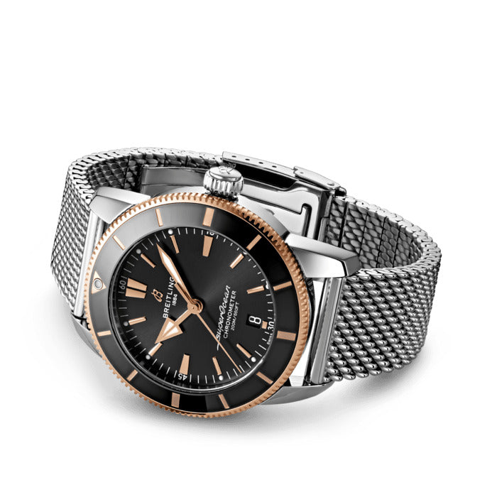Breitling Superocean Heritage B20 watch, 44mm, polished stainless steel case. Black dial with an 18k Red gold tone “B” emblem below the 12 o’clock position. Applied polished red gold index and painted luminous dot hour markers. Polished red gold hands, the hour and minute hands with luminous fill. Printed minute/seconds track. Date window located at the 6 o’clock position. The dial closed by a scratch-resistant sapphire crystal glare proofed both sides. Screw-down screw-locked crown with two gaskets. Solid case back. Unidirectional rotating bezel of 18kt red gold with a black ceramic top ring. The Watch comes with Breitling Caliber B20, beats at 28’800 vph, contains 26 Jewels and has an approximate power reserve of 70 hours. The watch presented on the Ocean Classic bracelet of Stainless Steel with Fold over clasp with a safety release. The water resistance is up to 200m/660ft.