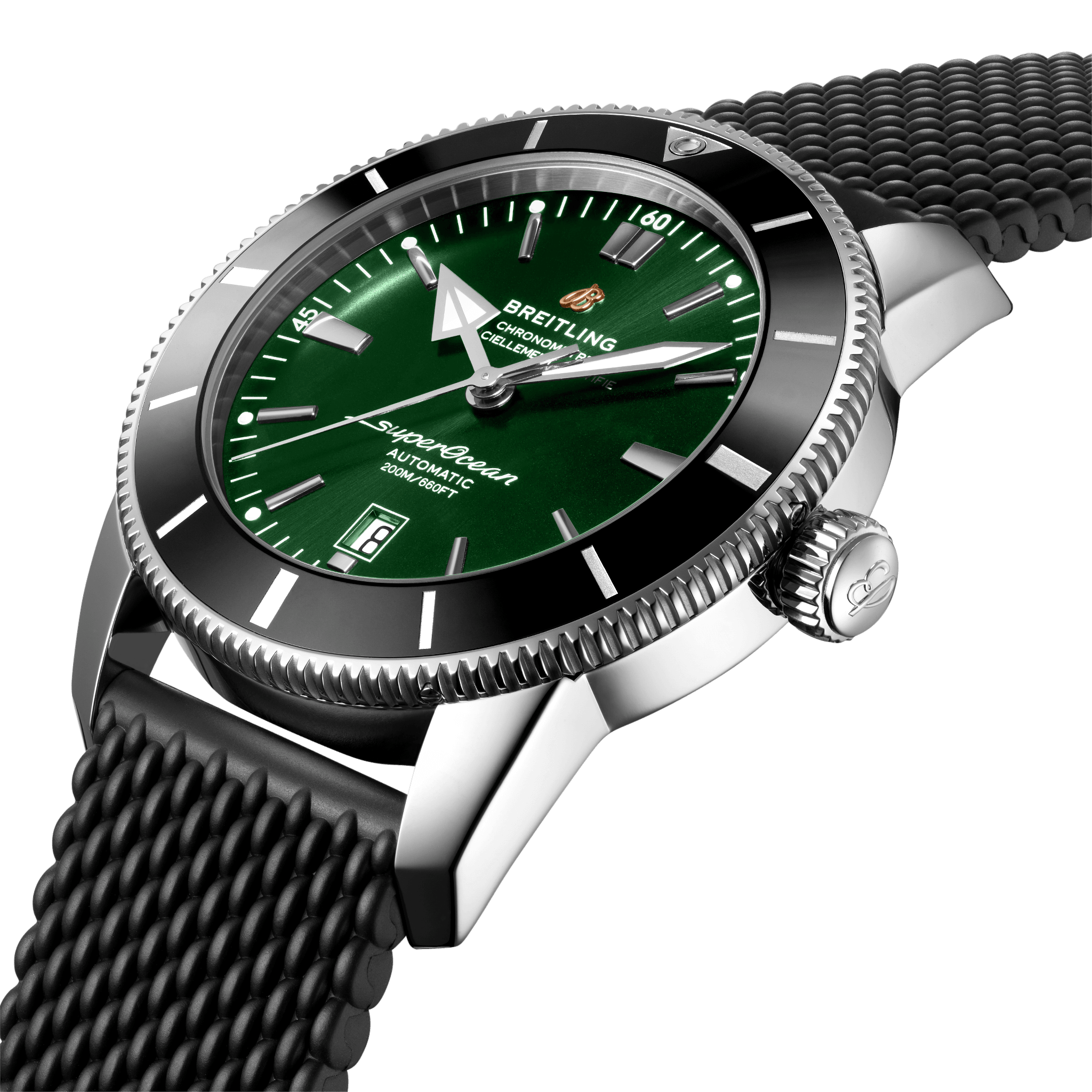Unworn watch Breitling Superocean Heritage B20 Automatic 46, polished stainless steel case 46mm, Reference AB2020121L1S1. The model has Green dial with a fine sunray finish and a “B” emblem below the 12 o’clock position. This watch is bold the iconic triangular-shaped large silver-tone different hands of polished steel with bold luminescent fill and applied polished stainless steel index hour markers with painted luminescent dot hour markers. Fine printed minute/seconds track with 15-minute Arabic numerals intervals on the outer perimeter. Date window located at the 6 o’clock position. The dial closed by a Cambered Scratch-resistant Sapphire Crystal with glare-proofed both sides. The watch has polished Stainless steel screw-locked crown with two gaskets. The crown has a ribbed edge for a comfortable grip and Breitling logo. They have solid screwed case back of Stainless steel. The watch is equipped Stainless Steel unidirectional-ratcheted rotating fluted bezel with a black ceramic top ring with silver in the form of index markers and a triangle at the origin. The Model comes with Breitling Caliber B20, beats at 28’800 vph, contains 26 Jewels and has an approximate power reserve of 70 hours. The watch presented on the Black Rubber Aero Classic strap with Stainless steel Push Button Folding Clasp. The water resistance is up to 200m/660ft.