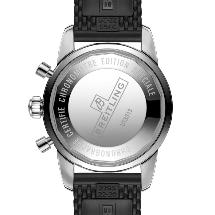 Breitling Superocean Heritage Chronograph watch 44mm in stainless steel, Reference U13313121B1S1. This model has sapphire crystal and solid watch back. Black dial with applied luminescent hour markers and luminescent filled hands. Chronograph functions and three sub-dials. Unidirectional rotating 18k Rose Gold bezel. The watch is automatic with Breitling 13 self-winding movement with day and date indicators, approximately 48 hours of power reserve. The watch presented on Black Rubber Strap with Push Button Folding Clasp.