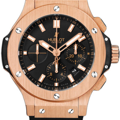 Hublot Big Bang, Original Gold Chronograph 44mm watch, 18k Rose Gold case with brushed and polished finishes, Reference 301.PX.1180.RX. Case center (edge) lateral black Kevlar inserts. This model has Solid black metallic dial with a fine sunburst texture. Applied brushed finished rose gold “applique” style Index hour markers with luminous fill. Gold printed minute track with 5-minute Arabic numerals intervals on flat black rim on the outer edge of the dial. Brushed finished rose gold hands with luminous filled tips (minutes & hours hands semi-skeleton). Small running seconds sub-dial hand located at the 9 o’clock position. Date window located between the 4 and 5 o’clock position. Rose Gold crown and chronograph buttons have rubber centers/inserts that match the black Kevlar. The dial closed by a Scratch-resistant Sapphire Crystal with Anti-reflective Treatment. Of Sapphire Crystal made transparent case back. Chronograph stopwatch functions: large central seconds counter with the “H” logo as a counter-weight; 30-minute sub-dial counter located at the 3 o’clock position; 12-hour sub-dial counter located at the 6 o’clock position. The watch is equipped brushed and polished finished 18kt rose gold bezel with a ridged edge, secured 6 immediately recognizable Hublots signature “H” screws style of Titanium. The watch is Hublot Caliber HUB 4100 automatic movement, contains 28 Jewels and has an approximate power reserve of 42 hours. This model presented on a Black Lined Rubber Straps with 18K Rose Gold and Black-plated Stainless Steel Deployant Buckle Clasp. The water resistance is up to 100m/330ft (10 ATM).