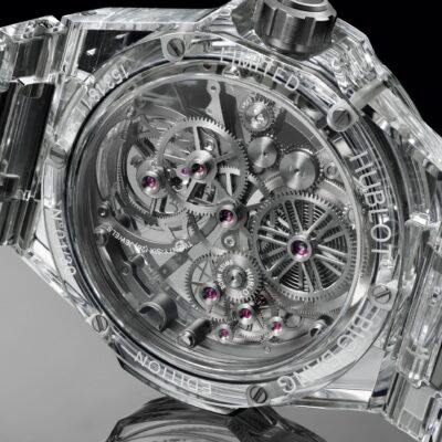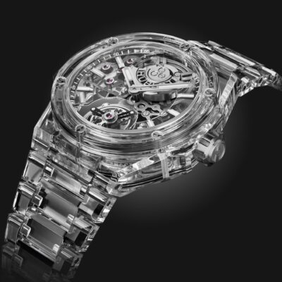 Unworn Hublot Big Bang INTEGRATED TOURBILLON FULL SAPPHIRE 455.JX.0120.JX. 43 mm, Sapphire Crystal dial, Polished Sapphire Crystal case, Multifaceted Sapphire with Anti-reflective Treatment crystal, Polished Sapphire Crystal with 6 H-shaped Titanium Screws bezel, HUB6035 calibre, Automatic Tourbillon Movement, 72 h power reserve, Polished Sapphire Crystal bracelet with Titanium Deployant Buckle Clasp. Water resistant to 30 m.