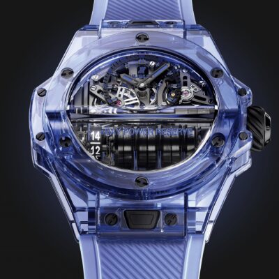 Unworn Hublot Big Bang MP-11 POWER RESERVE 14 DAYS BLUE SAPPHIRE Ref# 911.JL.0119.RX. 45 mm, Sapphire Crystal dial, Polished Blue Sapphire Crystal case, Sapphire with Anti-reflective Treatment crystal, Polished Blue Sapphire Crystal with 6 H-shaped Titanium Screws bezel, HUB911 calibre, Manual-winding Skeleton Power Reserve Movement with 7 Series-coupled Barrels and Power Reserve Display Roll, 14 days power reserve, Blue Structured Lined Rubber Straps with Black Ceramic and Black-plated Titanium Deployant Buckle Clasp. Water resistant to 30 m.
