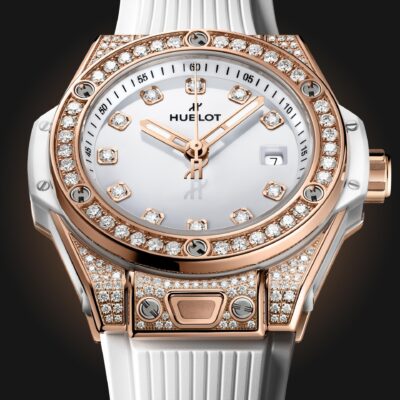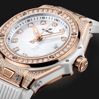 Unworn Hublot Big Bang ONE CLICK KING GOLD WHITE PAVÉ 485.OE.2210.RW.1604. 33 mm, Polished White Set with 11 Diamonds dial, Polished 18K King Gold Set with 130 Diamonds for 0.4ct case, Sapphire with Anti-reflective Treatment crystal, Polished 18K King Gold Set with 36 Diamonds for 0.76ct bezel, HUB1120 calibre, Self-winding Movement, 40hours power reserve, White Structured Lined Rubber Straps with 18K King Gold and Titanium Deployant Buckle Clasp. Water resistant to 100 m.