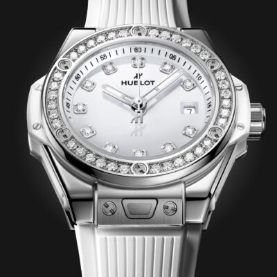 Unworn Hublot Big Bang ONE CLICK STEEL WHITE DIAMONDS 485.SE.2210.RW.1204. 33 mm, Polished White Set with 11 Diamonds dial, Polished and Satin-finished Stainless Steel case, Sapphire with Anti-reflective Treatment crystal, Polished Stainless Steel Set with 36 Diamonds for 0.76ct bezel, HUB1120 calibre, Self-winding Movement, 40hours power reserve, White Structured Lined Rubber Straps with Stainless Steel Deployant Buckle Clasp. Water resistant to 100 m.