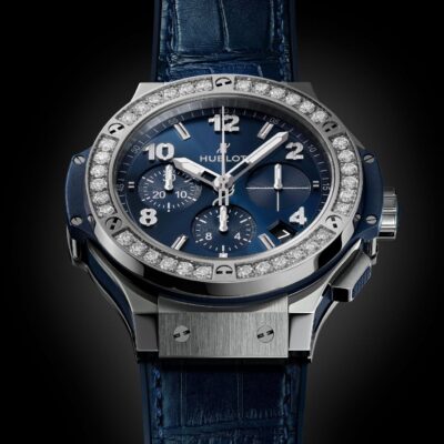 Hublot Big Bang, Steel Blue Diamonds, 41mm watch, Stainless steel case with brushed and polished finishes, Reference 341.SX.7170.LR.1204. Case center (edge) with lateral blue inserts. This model has Blue Sunray Satin-finished dial. Applied brushed finished steel “applique” style Index hour markers with luminous fill. White printed minute track with 5-minute Arabic numerals intervals on flat black rim on the outer edge of the dial. Brushed finished stainless steel hands with luminous filled tips (minutes and hours hands semi-skeleton). Small running seconds sub-dial hand located at the 9 o’clock position. Date window located between the 4 and 5 o’clock position. Stainless steel crown and chronograph buttons fitted with black rubber centers/inserts. Crown with function Push/pull. The dial closed by a Scratch-resistant Sapphire Crystal with Anti-reflective Treatment. Of Sapphire Crystal made transparent case back. Chronograph stopwatch functions: large central seconds counter with the “H” logo as a counter-weight; 30-minute sub-dial counter located at the 3 o’clock position; 12-hour sub-dial counter located at the 6 o’clock position. The watch is equipped brushed finished stainless steel bezel set with 36 brilliant cut diamonds (aprox. 1.31 carats), secured 6 immediately recognizable Hublots signature “H” screws style of Titanium. The watch is Hublot Caliber HUB 4300 automatic movement, contains 28 Jewels and has an approximate power reserve of 42 hours. This model presented on a Blue Rubber and Alligator Leather Straps with Stainless Steel Deployant Buckle Clasp. The water resistance is up to 100m/330ft (10 ATM).