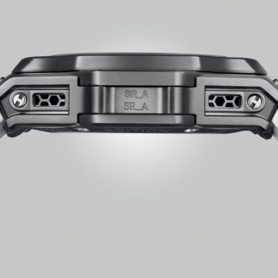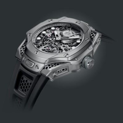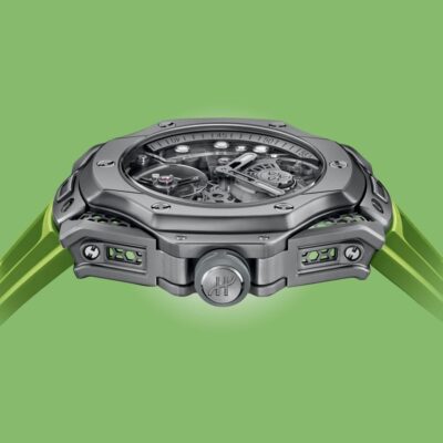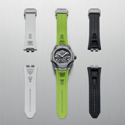 The result of the continued fruitful collaboration between Hublot and Samuel Ross is a new product for 2023, the Hublot Big Bang Tourbillon SR_A by Samuel Ross watch, Limited Edition, 44 mm, Reference 428.NX.0101.RX.SRA23, combining sacred geometric shapes, living materials and precision technology. Sophisticated limited edition men’s watch from Hublot has an industrial look thanks to the Shiny Microblasted Titanium used in every detail. You can wear this real work of art. Polished, brushed, forged and perforated titanium details give this watch a streamlined, elegant silhouette that evokes a sense of movement and innovation. This model features a sapphire skeletonized dial with large round luminous hour markers at 2, 3, 4 and 8, 9, 10 o’clock. Along the perimeter of the dial is an inner bezel with a minute track and silver Arabic numerals in 5-minute increments. Silver large rounded skeletonized minute and hour hands with luminous fill ensure perfect legibility. At the “6 o’clock” position, the manufacturer has placed a tourbillon, symmetrically to which at the “12” position there is a micro-rotor with an engraved Hublot logo. The dial closed by a Scratch-resistant Sapphire Crystal with Anti-reflective Treatment. The case back is also made of sapphire crystal, immediately behind, which is a special titanium plate, decorated with a grid of hexagonal perforations running across the dial, which provides additional light and makes the watch even lighter. She occupies the entire back cover and follows the skeletonized structure that forms the integrated lugs and sides. To highlight the overall gray monochrome look, the titanium crown is covered in gray rubber. The model decorates a fixed titanium bezel, secured with 6 instantly recognizable Hublots signature titanium “H” screws. The watch is Hublot Caliber HUB6035 Manufacture Automatic Tourbillon Movement, contains 26 Jewels and has an approximate power reserve of 72 hours. They are presented on an elegant and comfortable vivid green smooth rubber strap, with a Titanium Deployant Buckle clasp. Also included are black and white straps, which can be easily replaced in one click. The water resistance is up to 30m/100ft (3ATM).
