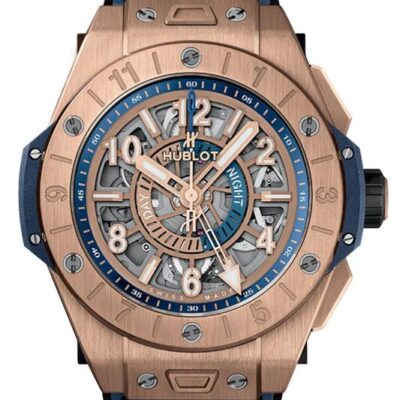 Hublot Big Bang Unico GMT King Gold, 45mm watch. 18k King Gold case, satin/brushed finished with fine polished corners, Reference 471.OX.7128.RX. This model has Blue and Gold-plated Skeleton dial with applied applique style alternating King Gold Arabic numerals and index hour markers with luminous fill. Blue composite resin lower bezel. Blue dial flange with a Rose Gold-tone minute/seconds track. White Arabic numeral minute markers at 5-minute interval. Bold Rose Gold -tone brushed finished hands with luminous fill (minutes and hours hands semi-skeleton). Blue tipped central seconds hand. Screw-down 18k King Gold crown with black rubber around the crown for enhanced grip. The dial closed by a Scratch-resistant Sapphire Crystal with Anti-reflective Treatment. Of Sapphire Crystal made transparent case back. GMT Time zone Function: engraved 12 hour markings on the bezel; central GMT hand: Skeletonized with luminous filled arrow-head; corresponding night/day zone ring in blue & king gold at the dial center; buttons at 2 and 4 o’clock advance and reverse the time in 1 hour increments. The watch is equipped fixed satin-finished 18k King Gold bezel with polished beveled corners, secured 6 immediately recognizable Hublots signature “H” screws style of Titanium. The watch is Hublot in-house manufacture Caliber UNICO HUB1251 contains 41 Jewels and has an approximate power reserve of 72 hours. This model presented on a Blue and black Structured Lined Rubber Strap with 18K King Gold and Black-plated Titanium Deployant Buckle Clasp. The water resistance is up to 100m/330ft (10 ATM).