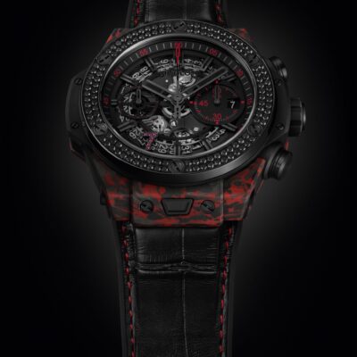 Unworn watch Hublot Big Bang Unico Red Carbon Black Diamonds Las Vegas Boutique, Matt Red Frosted carbon, 44mm, Reference 421.QV.1113.LR.1100.LVB23. Luxury watches for real men, created to honor the incredible spirit of Las Vegas. The classic 44mm Big Bang case is reimagined using a mix of lightweight carbon fiber and red fiberglass to reflect nightlife of the city, its luxurious casinos. This model has Matte Black Skeleton dial with index hour markers with luminous fill. Along the contour of the dial, there is a gray minute scale, in which every 5 minutes are marked with red Arabic numerals. Black brushed finished hands with luminous fill (minutes and hours hands semi-skeleton). Small running seconds sub-dial hand located at the 9 o’clock position. Date window located the 3 o’clock positions. The watch is adjusted using a black matte carbon fiber crown and chronograph pushers. The dial closed by a Scratch-resistant Sapphire Crystal with Anti-reflective Treatment. Of Sapphire Crystal made transparent case back with original red engraving. Chronograph stopwatch functions: column wheel chronograph mechanism; features a Flyback function, which allows instant restarting of the chronograph with a single push of the button; large elegant central seconds hand features a red tip and a counterweight in the form of the manufacturer’s emblem “H” logo; The central 60-minute counter sub-dial at 3 o’clock. What charm the watch a special touch is the fixed bezel made of polished black anodized aluminum, set with 126 black diamonds, secured with 6 instantly recognizable signature Hublots “H” style titanium screws. The watch is Hublot Caliber HUB 1280 UNICO Manufacture Self-winding Chronograph Flyback Movement with Column Wheel automatic movement, contains 43 Jewels and has an approximate power reserve of 72 hours. This model presented on a Black alligator Strap with red finishing stitching, which is fastened with Deployant Buckle Clasp Black ceramic and Black titanium. The water resistance is up to 100m/330ft (10 ATM).