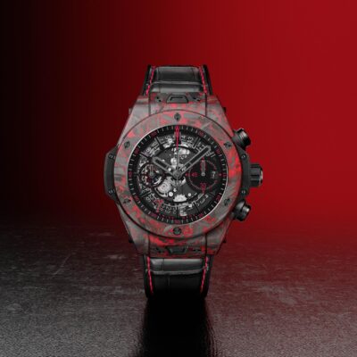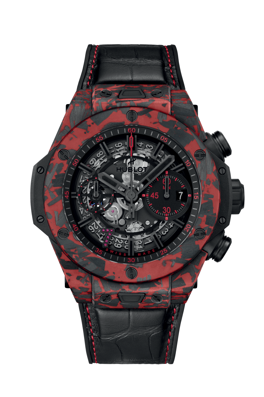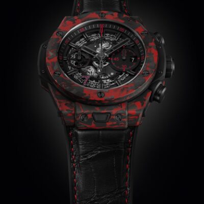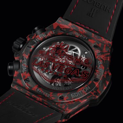 Unworn watch Hublot Big Bang Unico Red Carbon Las Vegas Boutique, Matt Red Frosted carbon, 44mm, Reference 421.QV.1113.LR.LVB23. Luxury watches for real men, created to honor the incredible spirit of Las Vegas. The classic 44mm Big Bang case is reimagined using a mix of lightweight carbon fiber and red fiberglass to reflect nightlife of the city, its luxurious casinos. This model has Matte Black Skeleton dial with index hour markers with luminous fill. The 7 o’clock position is marked with a large Arabic numeral 7 set in red stones. Along the contour of the dial, there is a gray minute scale, in which every 5 minutes are marked with red Arabic numerals. Black brushed finished hands with luminous fill (minutes and hours hands semi-skeleton). Small running seconds sub-dial hand located at the 9 o’clock position. Date window located the 3 o’clock positions. The watch is adjusted using a black matte carbon fiber crown and chronograph pushers. The dial closed by a Scratch-resistant Sapphire Crystal with Anti-reflective Treatment. Of Sapphire Crystal made transparent case back with original red engraving. Chronograph stopwatch functions: column wheel chronograph mechanism; features a Flyback function, which allows instant restarting of the chronograph with a single push of the button; large elegant central seconds hand features a red tip and a counterweight in the form of the manufacturer’s emblem “H” logo; The central 60-minute counter sub-dial at 3 o’clock. The watch is equipped fixed Matt Red Frosted carbon bezel, secured 6 immediately recognizable Hublots signature “H” screws style of Titanium. The watch is Hublot Caliber HUB 1280 UNICO Manufacture Self-winding Chronograph Flyback Movement with Column Wheel automatic movement, contains 43 Jewels and has an approximate power reserve of 72 hours. This model presented on a Black alligator Strap with red finishing stitching, which is secured with a black ceramic and black titanium folding clasp. The water resistance is up to 100m/330ft (10 ATM).