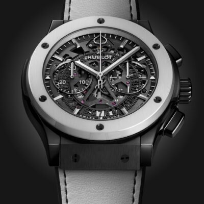 Unworn Hublot Classic Fusion AEROFUSION ASPEN SNOWMASS 525.CH.0121.VR.ASP21. 45 mm, Sapphire dial with special logo ASP21 Polished rhodium-plated appliques dial, Satin-finished and polished black Ceramic case, Sapphire with Anti-reflective Treatment crystal, Satin-finished and Polished White Ceramic with 6 H-shaped Titanium Screws bezel, HUB1155 calibre, Self-winding Skeleton Chronograph Movement, 42 Hours power reserve, Black rubber and white calf with black stitching with Black PVD Stainless Steel Deployant Buckle Clasp. Water resistant to 50 m.