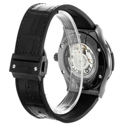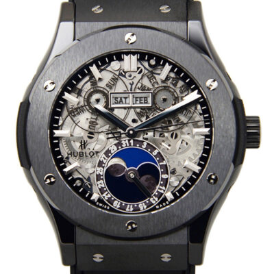 Hublot Classic Fusion Aerofusion Moonphase 45mm Black Magic watch, polished black ceramic case with brushed finished top and bottom center links between the lugs, Reference 517.CX.0170.LR. This model has transparent sapphire crystal main dial with applied polished finished index hour markers and polished finished hands. Black dial flange on the dial perimeter with fine printed minute/seconds track. Calendar functions: day and month windows located beneath the 12 o’clock position: day and month discs with black printed skeletonized date numbers, white background located at the display windows to highlight the current date; date displayed on the perimeter of the sub-dial at the 6 o’clock position; moonphase display sub-dial at the 6 o’clock position. Polished black ceramic crown engraved with the Hublot logo. The dial closed by a Scratch-resistant Sapphire Crystal with Anti-reflective Treatment. Of Sapphire Crystal made transparent case back. The watch is equipped fixed black ceramic bezel with a brushed finished top and polished finished beveled edge, secured with 6 polished “H” style titanium screws. Black composite resin “bezel lug” sandwiched between the bezel and case. The watch is self-winding mechanical Hublot Caliber HUB1131, contains 25 Jewels and has an approximate power reserve of 42 hours. This model presented on a black rubber strap with a stiched black alligator leather top with Black PVD Stainless Steel Deployant Buckle Clasp. The water resistance is up to 50m/150ft (5 ATM).