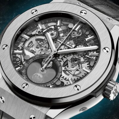 Hublot Classic Fusion Aerofusion Moonphase Titanium 45mm watch, Satin-finished and Polished Titanium case with brushed finished top and bottom center links between the lugs, Reference 517.NX.0170.LR. This model has Transparent sapphire crystal main dial with applied polished finished stainless steel index hour markers and polished finished stainless steel hands. Black inner bezel flange on the perimeter of the dial with fine printed minute/seconds track. Calendar functions: Day and month windows located beneath the 12 o’clock position. Day and month discs with black printed skeletonized date numbers, white background located at the display windows to highlight the current date; Date displayed on the perimeter of the sub-dial at the 6 o’clock position; Moonphase display sub-dial at the 6 o’clock position. Polished titanium crown engraved with the Hublot logo. The dial closed by a Scratch-resistant Sapphire Crystal with Anti-reflective Treatment. Of Sapphire Crystal made transparent case back. The watch is equipped fixed titanium bezel with a brushed finished top and polished finished beveled edge, secured with 6 polished “H” style titanium screws. Black composite resin “bezel lug” sandwiched between the bezel and case. The watch is Hublot Caliber HUB1131 Self-winding Moonphase Movement, contains 25 Jewels and has an approximate power reserve of 42 hours. This model presented on a Black rubber strap with a stiched black alligator leather top with Stainless Steel Deployant Buckle Clasp. The water resistance is up to 50m/150ft (5 ATM).
