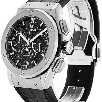 Hublot Classic Fusion Aerofusion Titanium Chronograph Automatic 45mm watch, Satin-finished and Polished Titanium case with brushed finished top and bottom center links between the lugs, Reference 525.NX.0170.LR. This model has Transparent sapphire crystal main dial with applied polished finished stainless steel index hour markers and polished finished stainless steel hands. Black inner bezel flange on the perimeter of the dial with fine printed minute/seconds track. The watch has Small-seconds sub-dial located at the 3 o’clock position. Chronograph/Stopwatch function: large central seconds counter with the “H” logo as a counter-weight; 30-minute sub-dial counter located at the 9 o’clock position. Polished titanium buttons control the chronograph. Date disc with black plated skeletonized date numbers, white background located at the 6 o’clock position to indicate the current date. Polished titanium crown with the Hublot logo. The dial closed by a Scratch-resistant Sapphire Crystal with Anti-reflective Treatment. Of Sapphire Crystal made transparent case back. The watch is equipped fixed titanium bezel with a brushed finished top and polished finished beveled edge, secured with 6 polished “H” style titanium screws. Black composite resin “bezel lug” sandwiched between the bezel and case. The watch is self-winding mechanical Hublot Caliber HUB1155, contains 60 Jewels and has an approximate power reserve of 42 hours. This model presented on a Black rubber strap with a stiched black alligator leather top with Stainless Steel Deployant Buckle Clasp. The water resistance is up to 50m/150ft (5 ATM).