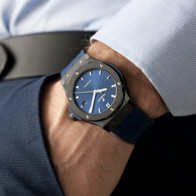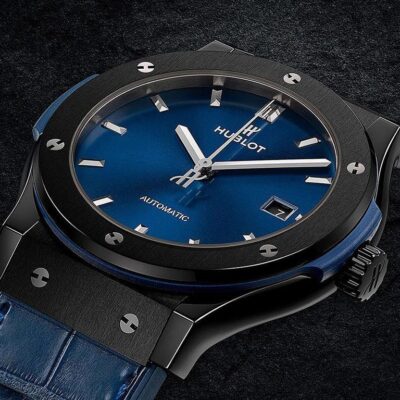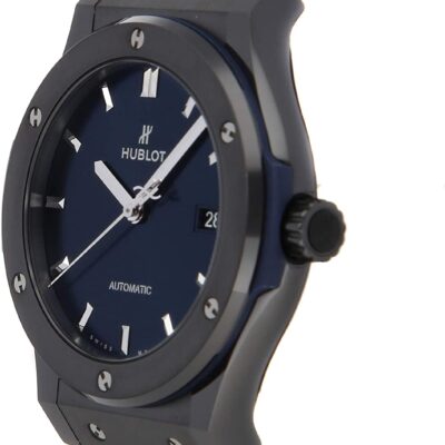 Hublot Classic Fusion Automatic 42mm watch, polished black ceramic case with brushed finished center links between the lugs, Reference 542.CM.7170.LR. This model has Satin-finished Blue Sunray dial with silver-tone polished rhodium plated hands and applied brushed finished stainless steel “applique” style index hour markers. Date window located the 3 o’clock positions. Polished black ceramic crown with rubber tip insert. It has the Hublot logo engraved on it. The dial closed by a Scratch-resistant Sapphire Crystal with Anti-reflective Treatment. Of Sapphire Crystal transparent case back made. The watch is equipped fixed Black ceramic bezel with brushed finished top and polished finished beveled edges, secured with 6 polished “H” style titanium screws. Blue composite resin “bezel lug” sandwiched between the bezel and case. The watch is self-winding mechanical Hublot Caliber HUB1110, contains 21 Jewels and has an approximate power reserve of 42 hours. This model presented on a blue rubber strap with a stiched blue (alligator) leather top with Black-plated Stainless Steel Push Button Folding Clasp. The water resistance is up to 50m/150ft (5 ATM).
