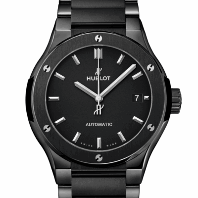 Hublot Classic Fusion Automatic 45mm Black Magic watch, polished and satin-finished black ceramic case with brushed finished top and bottom center links between the lugs, Reference 510.CM.1170.CM. This model has Matt black dial with applied brushed finished stainless steel “applique” style index hour markers and polished rhodium plated hands. Date window located the 3 o’clock positions. Polished black ceramic crown with rubber tip insert. On it, the Hublot logo engraved on it. The dial closed by a Scratch-resistant Sapphire Crystal with Anti-reflective Treatment. Of Sapphire Crystal made transparent case back. The watch is equipped fixed black ceramic bezel with a brushed finished top and polished finished beveled edge, secured with 6 polished “H” style titanium screws. Black composite resin “bezel lug” sandwiched between the bezel and case. The watch is self-winding mechanical Hublot Caliber HUB1112, contains 21 Jewels and has an approximate power reserve of 42 hours. This model presented on a Black ceramic bracelet with polished outer links and brushed finished center links with Black-plated Titanium Deployant Buckle Clasp. The water resistance is up to 50m/150ft (5 ATM).