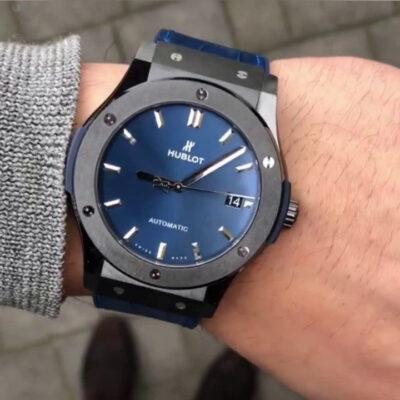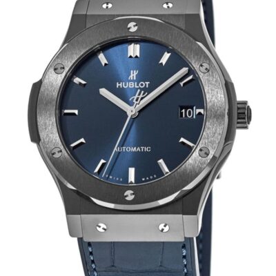 Hublot Classic Fusion Automatic 45mm watch, polished black ceramic case with brushed finished center links between the lugs, Reference 511.CM.7170.LR. This model has Satin-finished Blue Sunray dial with silver-tone polished rhodium plated hands and brushed finished stainless steel “applique” style index hour markers. Date window located the 3 o’clock positions. Polished black ceramic crown with rubber tip insert. It has the Hublot logo engraved on it. The dial closed by a Scratch-resistant Sapphire Crystal with Anti-reflective Treatment. Of Sapphire Crystal transparent case back made. The watch is equipped fixed Black ceramic bezel with brushed finished top and polished finished beveled edges, secured with 6 polished “H” style titanium screws. Blue composite resin “bezel lug” sandwiched between the bezel and case. The watch is self-winding mechanical Hublot Caliber HUB1112, contains 25 Jewels and has an approximate power reserve of 42 hours. This model presented on a blue rubber strap with a stiched blue (alligator) leather top with Black-plated Stainless Steel Push Button Folding Clasp. The water resistance is up to 50m/150ft (5 ATM).