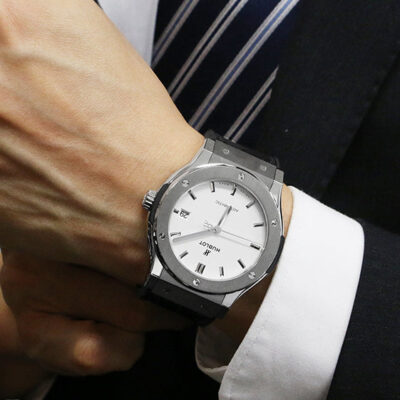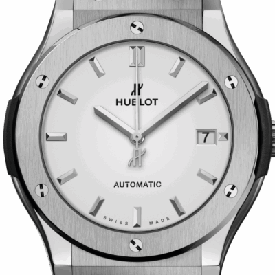 Hublot Classic Fusion Automatic 45mm watch, Grey Satin-finished and polished titanium case with brushed finished top and bottom center links between the lugs, Reference 511.NX.2611.LR. This model has Flat matte silver “opaline” dial with silver-tone polished rhodium plated hands and applied rhodium plated index hour markers. Date window located the 3 o’clock positions. Polished titanium crown with Pull / Press function. It has the Hublot logo engraved on it. The dial closed by a Scratch-resistant Sapphire Crystal with Anti-reflective Treatment. Of Sapphire Crystal transparent case back made. The watch is equipped fixed satin-finished and polished Grey Titanium bezel with a brushed finished top and polished finished beveled edge, secured with 6 polished “H” style titanium screws. Black composite resin “bezel lug” sandwiched between the bezel and case. The watch is self-winding mechanical Hublot Caliber HUB1112, contains 25 Jewels and has an approximate power reserve of 42 hours. This model presented on a Black rubber strap with a stiched Black (allligator) leather top with Titanium Deployant Buckle Clasp. The water resistance is up to 50m/150ft (5 ATM).