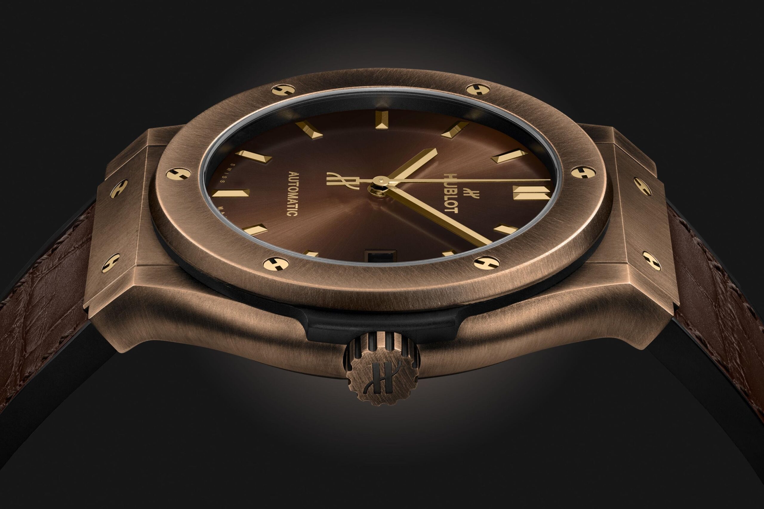 Unworn Hublot Classic Fusion BRONZE BROWN 511.BZ.3480.LR.ECU21. 45 mm, Sunray brown. Polished 3N gold-plated applique dial, Brushed bronze case, Sapphire with Anti-reflective Treatment crystal, Brushed bronze bezel, HUB1112 calibre, Self-winding Movement, 42 Hours power reserve, Brown alligator with brown stitching on black rubber Straps with Black brushed Bronze and black-plated stainless steel deployant buckle clasp. Water resistant to 50 m.