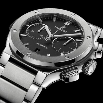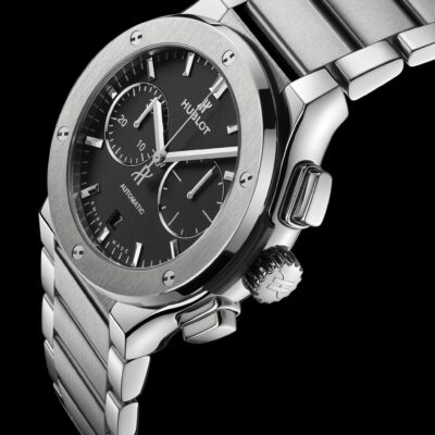 Hublot Classic Fusion Chronograph Automatic 45mm watch, satin-finished and polished titanium case with brushed finished top and bottom center links between the lugs, Reference 520.NX.1170.NX. This model has flat matte black dial with applied brushed finished stainless steel “applique” style index hour markers and polished rhodium plated hands. Minute markers around the outer rim. Small-seconds sub-dial located at the 3 o’clock position. Chronograph/Stopwatch function: large central seconds counter with the “H” logo as a counter-weight; 30-minute sub-dial counter located at the 9 o’clock position. Polished titanium chronograph buttons. Date window located the 6 o’clock positions. Polished titanium crown with Pull / Press function. On it, the Hublot logo engraved on it. The dial closed by a Scratch-resistant Sapphire Crystal with Anti-reflective Treatment. Of Sapphire Crystal made transparent case back. The watch is equipped fixed titanium bezel with a brushed finished top and polished finished beveled edge, secured with 6 polished “H” style titanium screws. Black composite resin “bezel lug” sandwiched between the bezel and case. The watch is self-winding mechanical Hublot Caliber HUB1143, contains 59 Jewels and has an approximate power reserve of 42 hours. This model presented on a satin-finished and polished titanium bracelet with polished outer links and brushed finished center links with titanium Deployant Buckle Clasp. The water resistance is up to 50m/150ft (5 ATM).