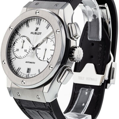 Hublot Classic Fusion Chronograph Automatic 45mm watch, Satin-finished and polished titanium case with brushed finished top and bottom center links between the lugs, Reference 521.NX.2611.LR. This model has Matte silver “opaline” main dial with contrasting metallic silvered sub-dials with silver-tone polished rhodium plated hands and brushed finished stainless steel “applique” style index hour markers. Minute markers around the outer rim. Small-seconds sub-dial located at the 3 o’clock position. Chronograph/Stopwatch function: large central seconds counter with the “H” logo as a counter-weight; 30-minute sub-dial counter located at the 9 o’clock position. Polished titanium chronograph buttons. Date window located the 6 o’clock positions. Polished titanium crown with the Hublot logo. The dial closed by a Scratch-resistant Sapphire Crystal with Anti-reflective Treatment. Of Sapphire Crystal made transparent case back. The watch is equipped fixed Titanium bezel with brushed finished top and polished finished beveled edges, secured with 6 polished “H” style titanium screws. Black composite resin “bezel lug” sandwiched between the bezel and case. The watch is self-winding mechanical Hublot Caliber HUB1143, contains 59 Jewels and has an approximate power reserve of 42 hours. This model presented on a black rubber strap with a stiched (alligator) leather top with Stainless Steel Deployant Buckle Clasp. The water resistance is up to 50m/150ft (5 ATM).