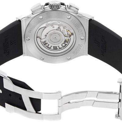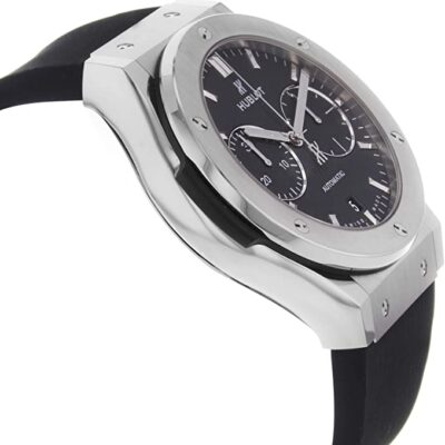 Hublot Classic Fusion Chronograph Titanium 45mm watch. Polished titanium case with brushed finished top and bottom center links between the lugs, Reference 521.NX.1171.RX. This model has Flat Matte Black dial with a polished Rhodium plated hands. Applied brushed finished Stainless Steel “applique” style index hour markers. Minute markers around the outer rim. Small-seconds sub-dial located at the 3 o’clock position. Chronograph/Stopwatch function: large central seconds counter with the “H” logo as a counter-weight; 30-minute sub-dial counter located at the 9 o’clock position. Polished titanium chronograph buttons. Date window located the 6 o’clock positions. Polished titanium crown with Pull/push function. On it, the Hublot logo engraved on it. The dial closed by a Scratch-resistant Sapphire Crystal with Anti-reflective Treatment. Of Sapphire Crystal made transparent case back. The watch is equipped fixed titanium bezel with brushed finished top and polished finished beveled edges, secured with 6 polished “H” style Titanium screws. Black composite resin “bezel lug” sandwiched between the bezel and case. The watch is self-winding mechanical Hublot Caliber HUB1143, contains 59 Jewels and has an approximate power reserve of 42 hours. This model presented on a Black Lined Rubber Straps with Stainless Steel Deployant Buckle Clasp. The water resistance is up to 50m/150ft (5 ATM).