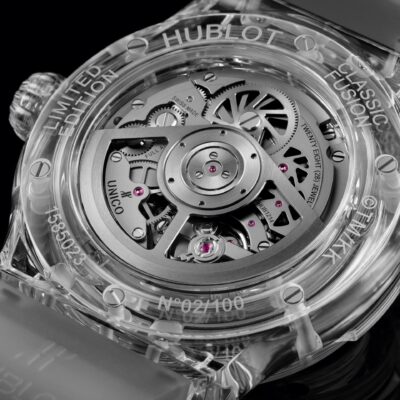 Unworn Hublot Classic Fusion TAKASHI MURAKAMI SAPPHIRE RAINBOW 507.JX.0800.RT.TAK21. 45 mm, Microblasted Rhodium-plated Rotating Decor with 12 petals set with 384 Colored Gemstones Rubies, Pink Sapphires, Amethysts, Blue Sapphires, Tsavorites, Yellow Sapphires, Orange Sapphires dial, Polished Sapphire Crystal case, Sapphire with Anti-reflective Treatment crystal, Polished Sapphire Crystal bezel, HUB1214 UNICO calibre, Manufacture Self-winding Movement, 72 Hours power reserve, Transparent Lined Rubber Straps with Stainless Steel Deployant Buckle Clasp. Water resistant to 50 m.