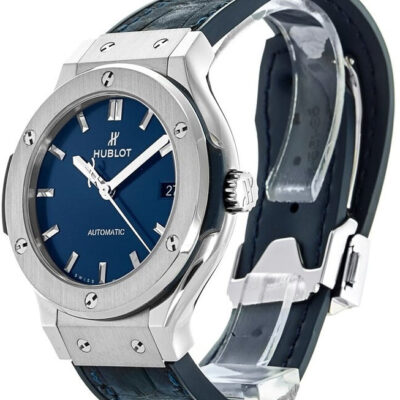 Hublot Classic Fusion Titanium Blue 38mm watch. Grey polished Titanium case with brushed finished top and bottom center links between the lugs, Reference 565.NX.7170.LR. This model has Blue Sunray Satin-finished dial with applied polished index hour markers and rhodium plated hands. Date window located the 3 o’clock positions. Polished titanium crown, Pull/push function and engraved with the Hublot logo. The dial closed by a Scratch-resistant Sapphire Crystal with Anti-reflective Treatment. Of Sapphire Crystal, transparent case back made. The watch is equipped fixed Satin-finished Titanium bezel polished finished beveled edge, secured with 6 polished “H” style Titanium screws. Blue composite resin “bezel lug” sandwiched between the bezel and case. The watch is self-winding mechanical Hublot Caliber HUB1110, contains 21 Jewels and has an approximate power reserve of 42 hours. This model presented on Blue alligator leather strap with Push Button Folding Clasp. The water resistance is up to 50m/150ft (5 ATM).