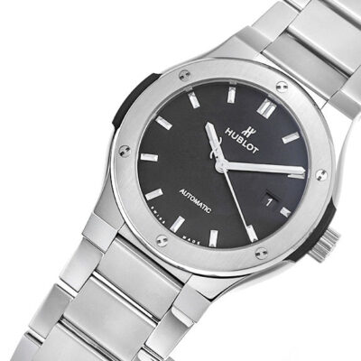 Hublot Classic Fusion Titanium Bracelet 42mm watch. Polished Titanium case with brushed finished top and bottom center links between the lugs, Reference 548.NX.1170.NX. This model has flat matte black dial with applied polished finished Stainless Steel index hour markers and polished finished Stainless Steel hands. Date window located the 3 o’clock positions. Polished titanium crown, Pull/push function and engraved with the Hublot logo. The dial closed by a Scratch-resistant Sapphire Crystal with Anti-reflective Treatment. Of Sapphire Crystal, transparent case back made. The watch is equipped fixed Satin-finished Titanium bezel polished finished beveled edge, secured with 6 polished “H” style Titanium screws. Black composite resin “bezel lug” sandwiched between the bezel and case. The watch is self-winding mechanical Hublot Caliber HUB1110, contains 21 Jewels and has an approximate power reserve of 42 hours. This model presented on Polished and Satin-finished Titanium Bracelet with Titanium Deployant Buckle Clasp. The water resistance is up to 50m/150ft (5 ATM).