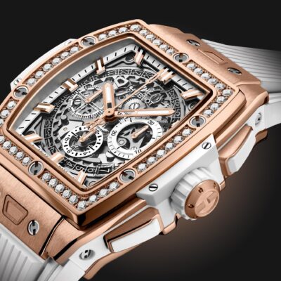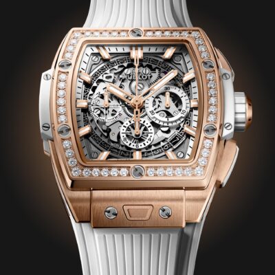 Unworn Hublot Spirit of Big Bang KING GOLD WHITE DIAMONDS Ref# 642.OE.2010.RW.1204. 42 mm, Sapphire Crystal dial, Satin-finished and Polished 18K King Gold case, Sapphire with Anti-reflective Treatment crystal, Satin-finished and Polished 18K King Gold Set with 48 Diamonds, 6 H-shaped Titanium Screws bezel, HUB4700 calibre, Self-winding Skeleton Chronograph Movement, 50hours power reserve, White Structured Lined Rubber Straps with 18K King Gold and Titanium Deployant Buckle Clasp. Water resistant to 100 m.