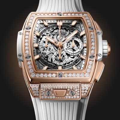 Unworn Hublot Spirit of Big Bang KING GOLD WHITE PAVÉ 642.OE.2010.RW.1604. 42 mm, Sapphire Crystal dial, Satin-finished and Polished 18K King Gold Set with 166 Diamonds case, Sapphire with Anti-reflective Treatment crystal, Satin-finished and Polished 18K King Gold Set with 48 Diamonds, 6 H-shaped Titanium Screws bezel, HUB4700 calibre, Self-winding Skeleton Chronograph Movement, 50hours power reserve, White Structured Lined Rubber Straps with 18K King Gold and Titanium Deployant Buckle Clasp. Water resistant to 100 m.