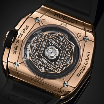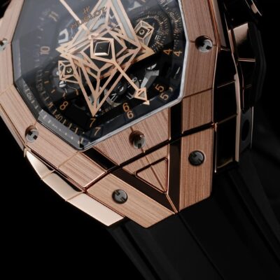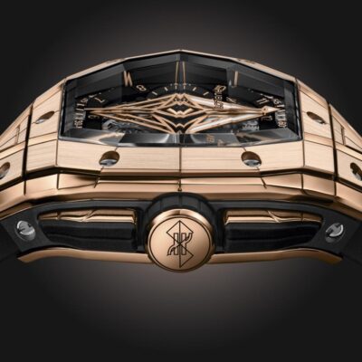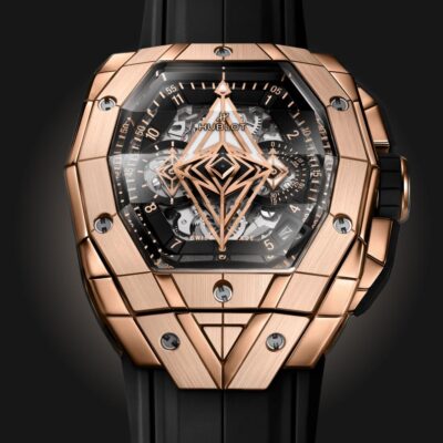 Unworn man’s watch Hublot, Spirit of Big Bang Sang Bleu King Gold, 42mm, Ref# 648.NX.0107.RX.MXM23. The new 2023 product from Hublot has delighted fans of the work of Maxime Plescia-Buchi, who translates the language of his geometric tattoos into an explosive 3D sculptural composition of futuristic watches. A stunning combination of three-dimensional geometric shapes in 18k King Gold gives the barrel-shaped case a new identity: the elongated bezel and case form a striking diamond structure – Buchi’s signature geometric shape. It consists of many individual geometric parts – hexagons, diamonds and triangles – skillfully combined into a single piece. In addition to the 3D effect, the faceted components rise, fall, are highlighted by vertical matte finishes, and polished surfaces. The complex design of the case is fully matched by a sapphire crystal dial with a skeletonized signature Buchi diamond structure in the center: an 18k King Gold large diamond-shaped hand with Super-LumiNova indicates the hours, and a smaller one indicates the minutes. The dodecagonal sapphire crystal has a minute track with 18k King Gold Arabic numerals every 5 minutes, and towards the center, there is a black 10-sided track with 18k King Gold hour markers printed in Arabic numerals. The chronograph includes a thin, large central seconds hand, as well as two subdials with diamond-shaped hands (as far as hands can be called) showing a small seconds at 9 o’clock and a 30-minute chronograph counter at 3 o’clock. He is controlled by polished 18k King Gold pushers at the 2 and 4 o’clock positions. A window between the 4 and 5 o’clock positions shows the date. The polished 18k King Gold crown has an engraved Hublot logo and a rubber shock absorber with grooves for better grip. The anti-reflective sapphire crystal that covers the dial is equally sculptural. It not only provides protection, but also creates increased volume and optical distortion. The back cover is also made of sapphire glass, which makes it possible to see the details of the mechanism with your own eyes and adds a touch of originality. The real highlight of the watch is the complex elongated bezel made of Satin-finished and Polished 18k King Gold, secured with 6 immediately recognizable titanium “H” screws with the Hublots signature inscription. The flawless operation of the watch is ensured by the HUB4700 Self-winding Skeleton Chronograph Movement, which contains 31 jewels and has an approximate power reserve of 50 hours. This model is presented on an elegant and comfortable Black Smooth Rubber Strap and 18k King Gold and Black PVD Titanium Deployant Buckle Clasp. Water resistance is up to 100m/330ft (10 ATM).