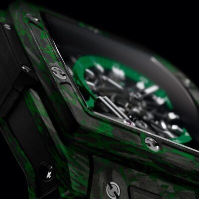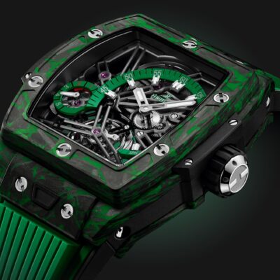 Unworn Hublot Spirit of Big Bang TOURBILLON CARBON GREEN 645.QG.5217.RX. 42 mm, Sapphire Crystal dial, Carbon Fiber with Green Micro-glass Fibers case, Sapphire with Anti-reflective Treatment crystal, Carbon Fiber with Green Micro-glass Fibers bezel, HUB6020 calibre, Manufacture Manual-winding Power Reserve Skeleton Tourbillon Movement, 115 Hours power reserve, Black and Green Structured Lined Rubber Straps with Titanium Deployant Buckle Clasp. Water resistant to 100 m.
