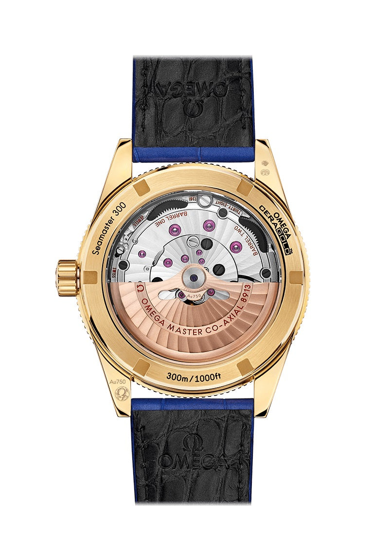 Unworn Omega Seamaster 300 CO‑AXIAL MASTER CHRONOMETER 234.63.41.21.99.002. 41 mm, Blue dial, Yellow gold case, Ceramic bezel, 8913 calibre, Self Winding Movement, 60 hours power reserve, Leather strap with Foldover clasp. Water resistant to 300 m.