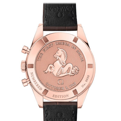 Unworn Omega Speedmaster ANNIVERSARY SERIES CHRONOGRAPH 311.63.40.30.02.001. 39.7 mm, Opaline silvery dial, Sedna™ gold case, Brown polished ceramic bezel ring and a matt chromium nitride tachymeter scale, 1861 calibre, Manual winding Movement, 18 jewels, 48 hour power reserve, Brown leather strap with Buckle clasp. Water resistant to 50 m.