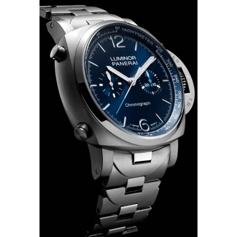 Unworn Panerai Luminor Chrono PAM01110. 44 mm, Blue dial, AISI 316L brushed steel case, Polished Steel bezel, P.9200 calibre, Automatic mechanical Movement, 41 jewels, 42 hours power reserve, Steel Steel straps. Water resistant to 100 m.