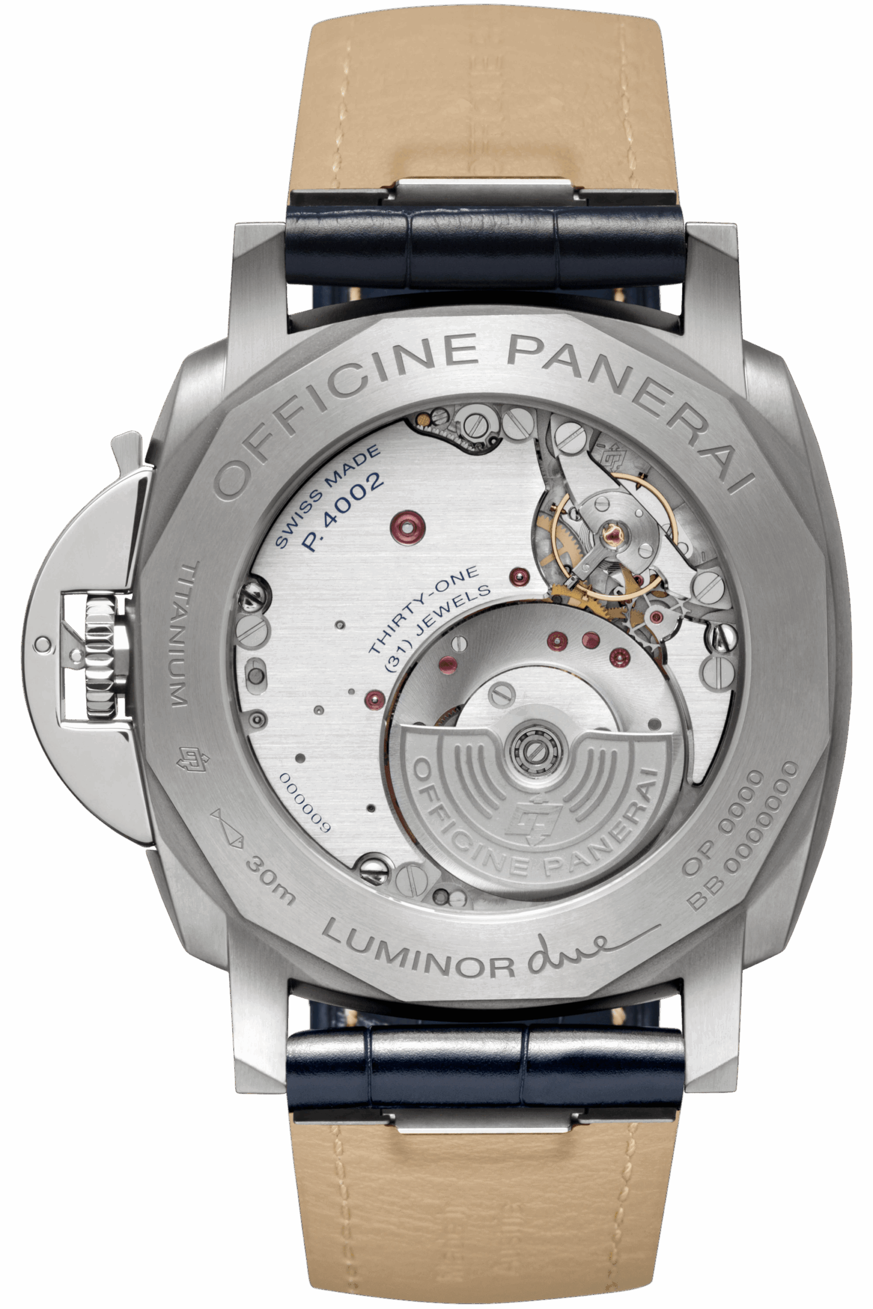 Unworn Men’s Watch Panerai Luminor Due GMT Power Reserve – 45mm, of Grey brushed titanium case, Reference PAM00964. The model has Blue sun-brushed dial with polished Rose Gold-tone hands with luminous fill and center Rose Gold-tone GMT hand. This watch is engraved hour markers in a combination of Arabic Numerals in the 6, 9, and 12 o’clock positions and indexes, with luminous fill. At the 9 o’clock position of the dial is located small seconds sub-dial with luminous Rose Gold-tone hand and indexes with 24-hour indicator. 30 minutes marked in bold luminous marks. This Officine Panerai signature element speaks innovation and seamless function. Date window located 3 o’clock position. At 5 o’clock position situated power reserve indicator with Rose Gold-tone hands and 0, 36, 72 hours marked in bold luminous marks. The dial closed by a Scratch-resistant Sapphire Crystal. The watch has Panerai’s (protected as a trademark) instantly recognizable crown protector and screws down the crown of Grey brushed titanium with a ribbed edge for a comfortable grip. They have case shape Round and transparent case back of Sapphire Crystal made. The watch is equipped fixed polished titanium bezel. The Model comes with Automatic mechanical movement Panerai in-house Caliber P.4002 contains 31 Jewels and has an approximate 3-day (72-hour) power reserve. The watch presented on a Dark blue Alligator/Crocodile Leather Strap with Beige Stitching and secured by a titanium Tang Buckle Clasp. The water resistance is up to 30m/100ft.