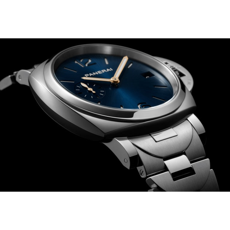 Unworn Panerai Luminor Due PAM01123. 38 mm, Blue sun-brushed dial, Polished steel case, Polished steel bezel, P.900 calibre, Automatic mechanical Movement, 23 jewels, 3 days power reserve, Steel Steel bracelet. Water resistant to 30 m.