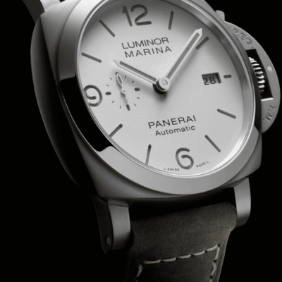 Unworn Men’s Watch Panerai Luminor Marina – 44mm of polished Stainless steel case, Reference PAM01314. The model has White dial with silver-tone polished steel hour and minute hands with luminous fill. This watch is engraved large silver-tone combination of Arabic numeral the 6, 9, 12 o’clock positions and large silver-tone Index hour markers with luminous fill. At the 9 o’clock position of the dial is located small seconds sub-dial with luminous silver-tone polished steel leaf-shaped hand. Marked every 15 minutes with bold luminous indices. This Officine Panerai signature element speaks innovation and seamless function. Date window located 3 o’clock position. The dial closed by a Scratch-resistant Sapphire Crystal. The watch has Panerai’s (protected as a trademark) instantly recognizable crown protector and screws down the crown of polished Stainless steel with a ribbed edge for a comfortable grip. They have case shape Round and solid case back of Stainless steel made. The watch is equipped fixed polished Stainless steel bezel. The Model comes with Automatic mechanical movement Panerai in-house Caliber P.9010 contains 31 Jewels and has an approximate 3-day (72-hour) power reserve. The watch presented on a Scamosciato Black leather strap with Ecru Stitching and secured by a Tang Buckle Clasp of Stainless steel. The water resistance is up to 300m/1000ft.