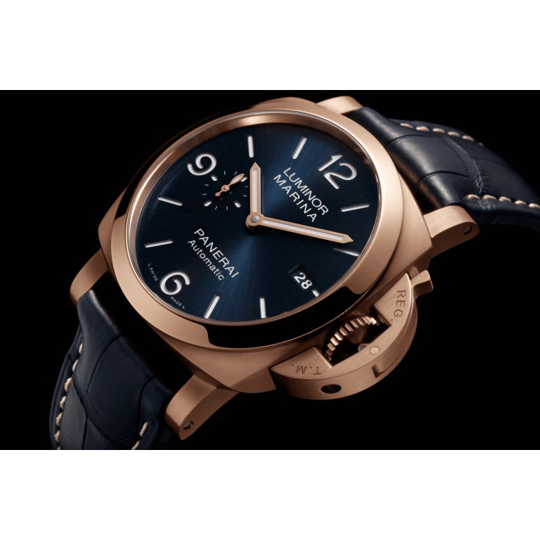 Unworn Panerai Luminor Marina Goldtech™ Sole Blu PAM01112. 44 mm, Blue dial, Brushed Panerai Goldtech™ case, Polished Panerai Goldtech™ bezel, P.9010 calibre, Automatic mechanical Movement, 31 jewels, 3 days power reserve, Alligator Dark blue straps. Water resistant to 50 m.